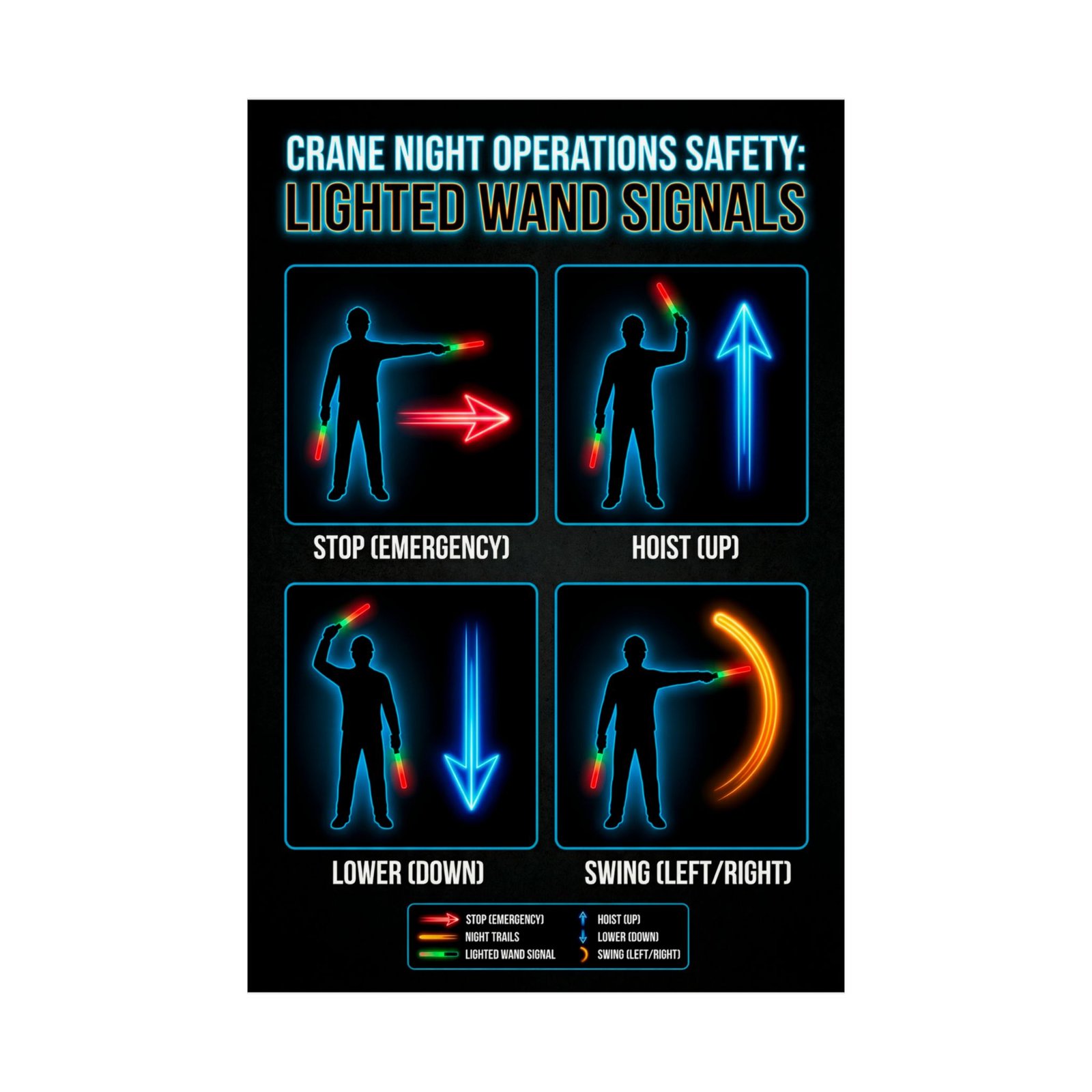 Eliminate the dangers of low-visibility communication with the crane night operations safety poster. Specifically engineered for 24-hour worksites, this chart illustrates the correct use of lighted wand signals using high-contrast neon motion trails. When standard hand signals become invisible in the dark, this poster ensures your signal persons and operators remain perfectly synchronized.