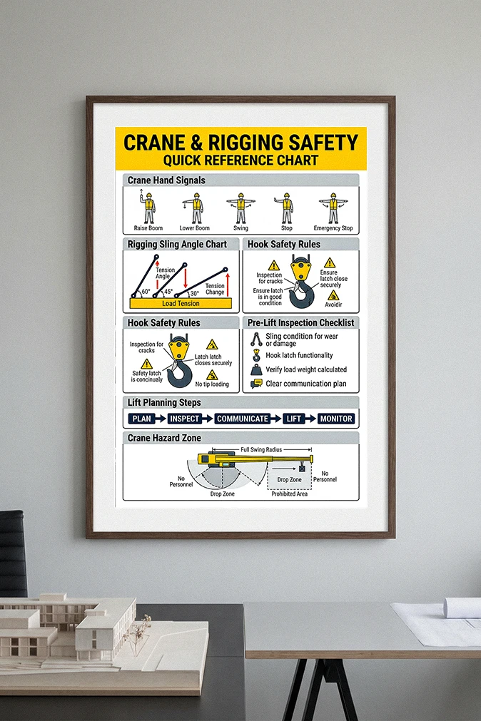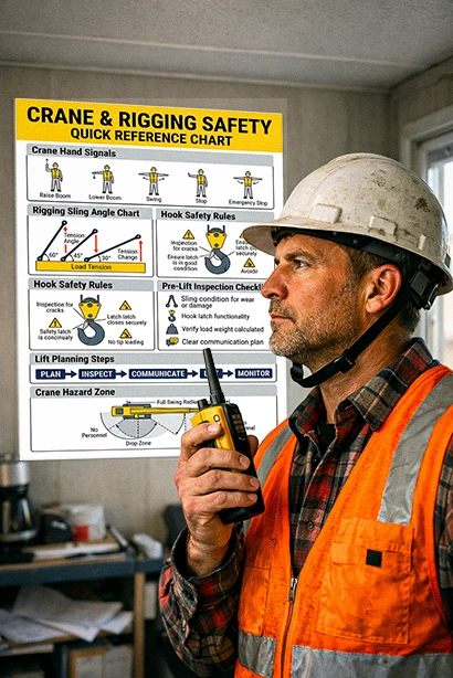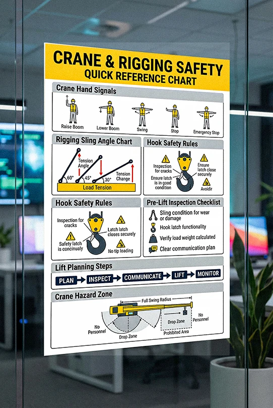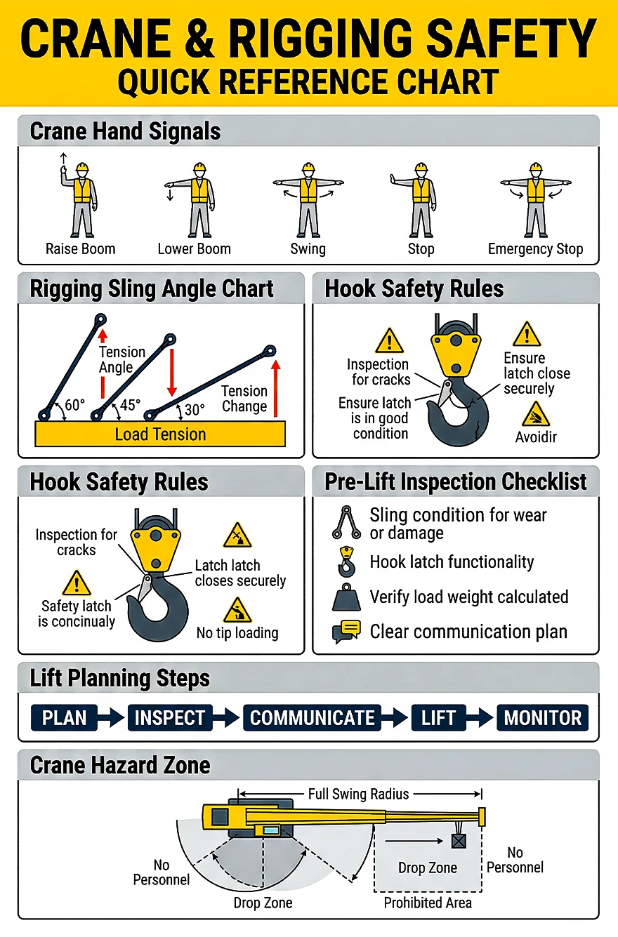 Crane and Rigging Safety Chart – Hand Signals, Sling Angles & Pre-Lift Inspection Guide