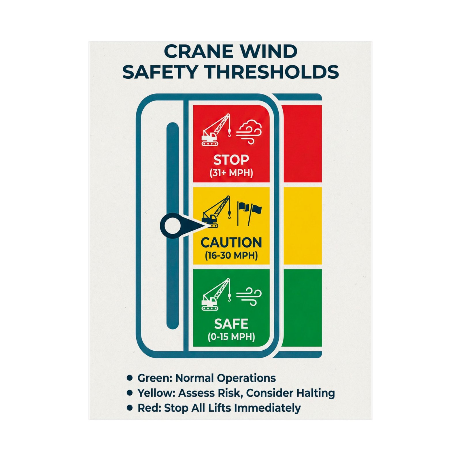 Provide your crew with an objective visual guide for weather-related decisions with the crane wind safety thresholds poster. This instructional reference transforms complex wind load variables into a clear, color-coded vertical gauge. Whether mounted in a crane cabin or a site trailer, it reinforces the critical boundaries between normal operations and mandatory stop-work conditions.