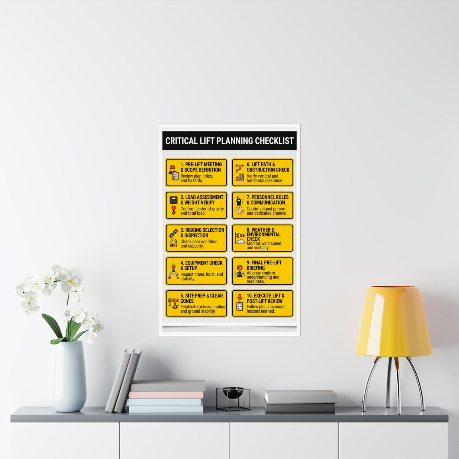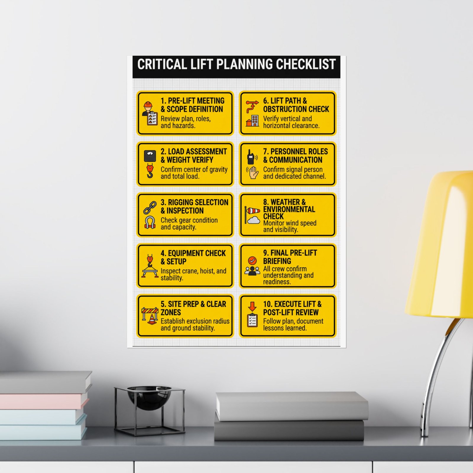 This critical lift planning checklist is printed on 175–189 g/m² heavyweight archival paper with a matte, glare-free finish. This ensures that the checklist remains readable even under the bright LED lights of a construction trailer or the harsh afternoon sun. Using Giclée printing technology, the safety-yellow panels and bold black headers remain sharp and fade-resistant, providing a durable reference that lasts the duration of your project.