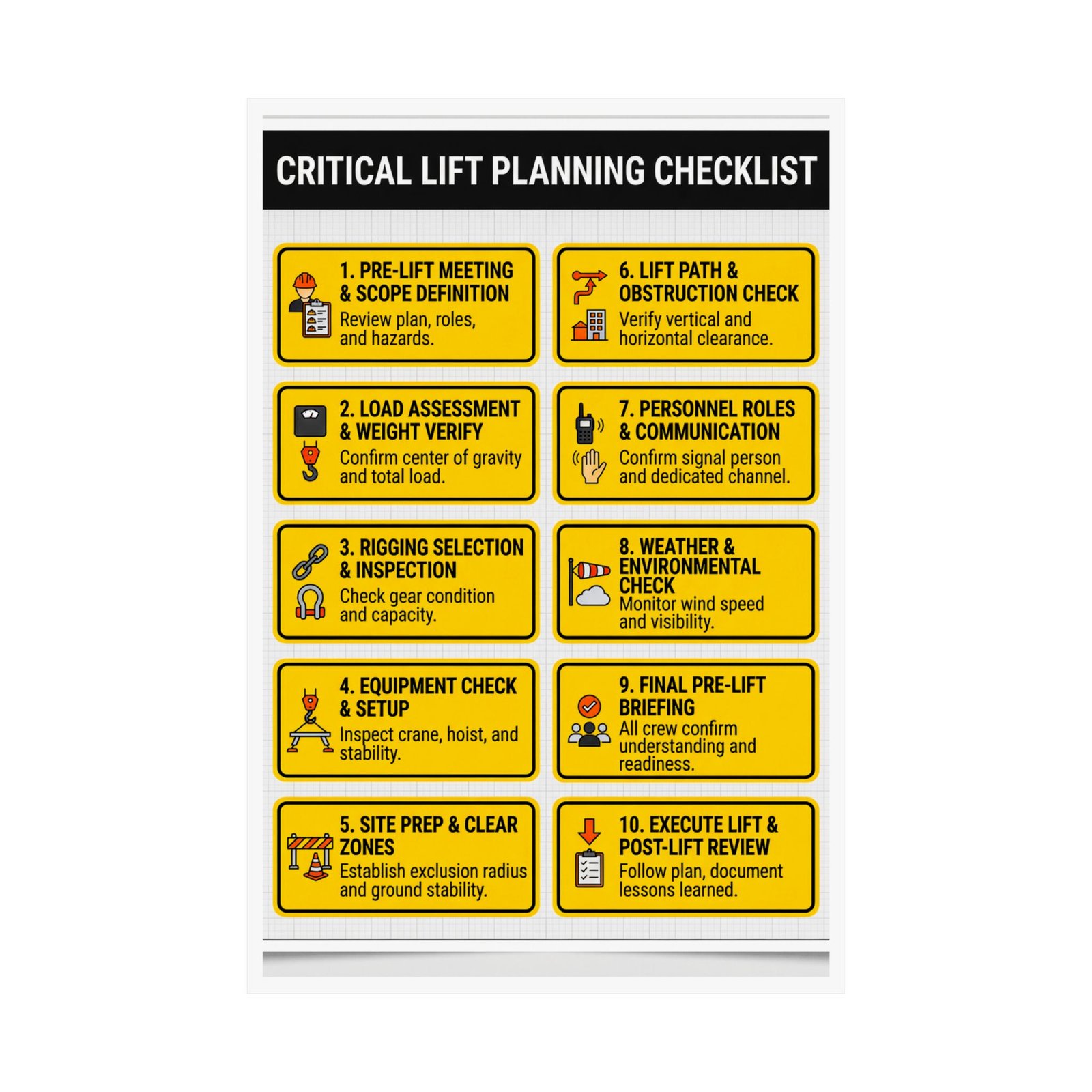 In the complex world of heavy rigging, a critical lift planning checklist is your first line of defense against catastrophic failure. Critical lifts—those involving heavy loads, multi-crane operations, or lifts over sensitive areas—demand a higher level of procedural rigor. This poster serves as a visual framework, ensuring that no step, from Weight Verification to Weather Checks, is overlooked during the high-pressure environment of a pre-lift briefing.