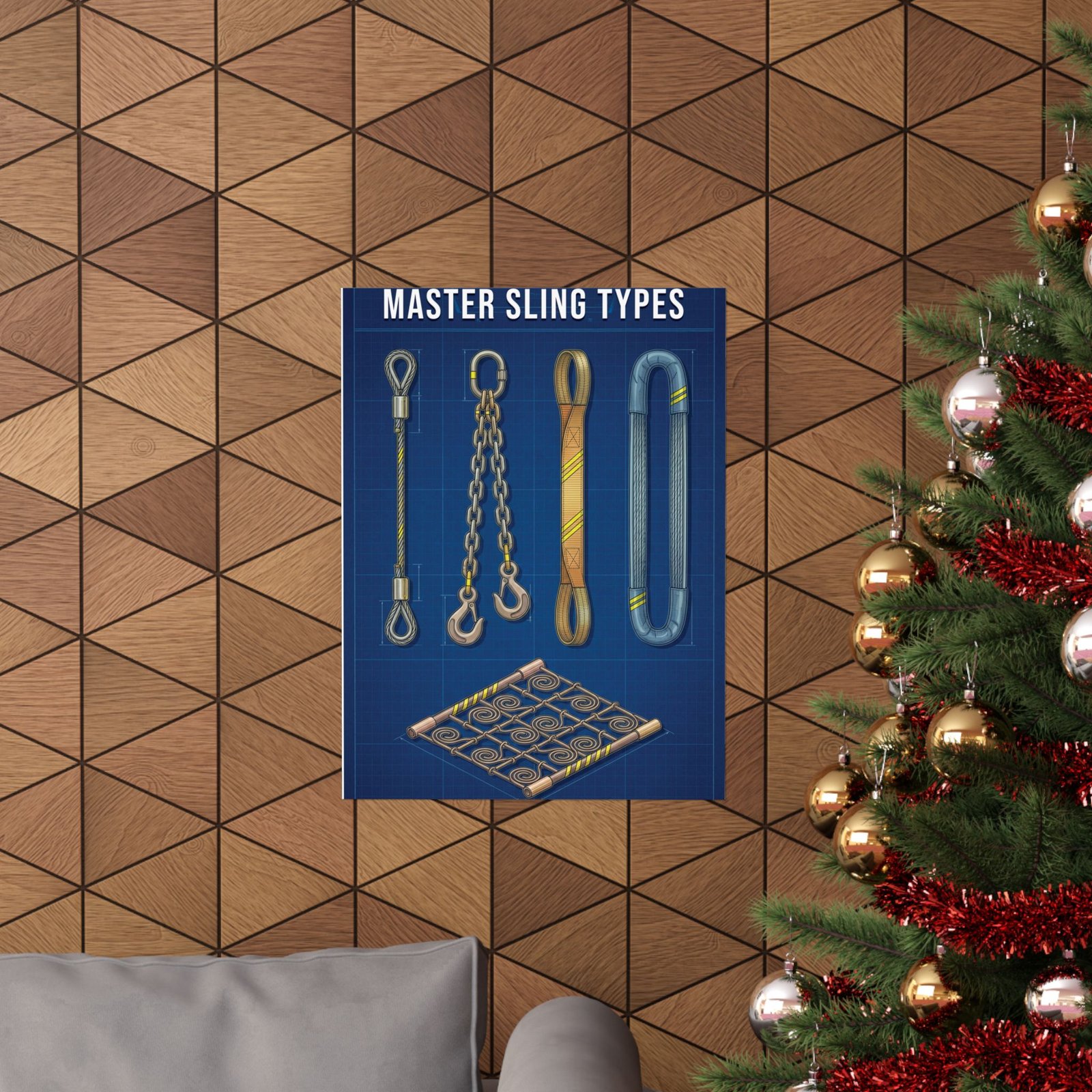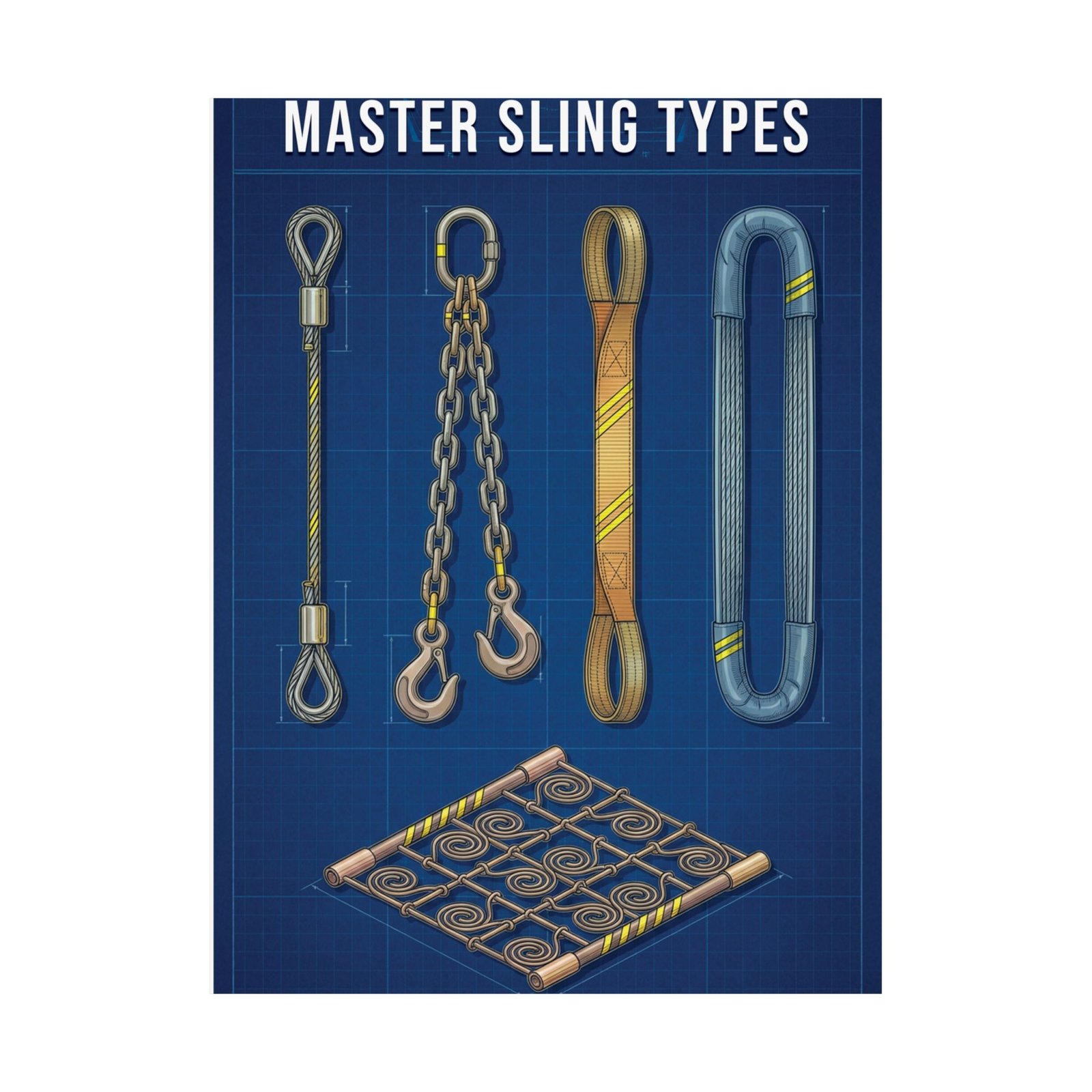 Master sling types poster presenting a clear, design-forward overview of common lifting sling configurations for planning and reference.