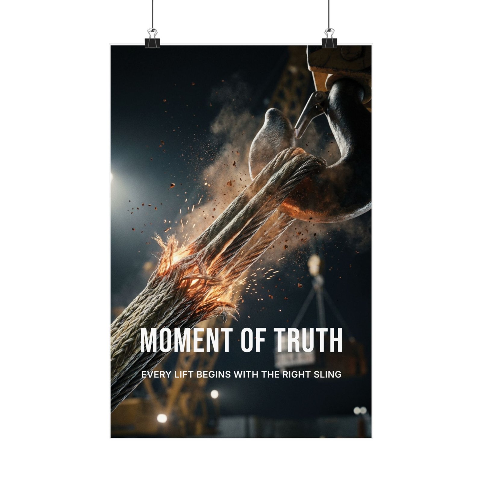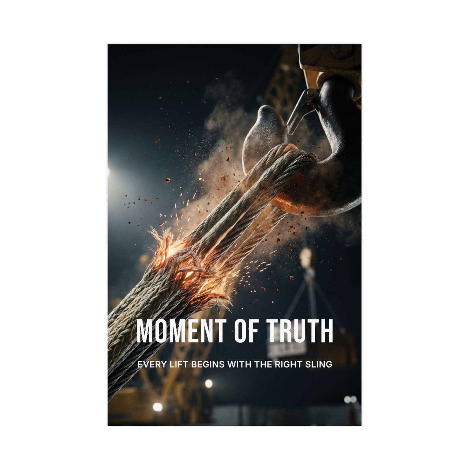 The moment of truth poster captures a single, high-tension instant — rope fibers straining under heat and load, frozen at the point where outcomes are decided. The imagery feels cinematic and deliberate, emphasizing that brief window when planning, setup, and judgment meet reality. Bold typography anchors the composition, turning the visual into a focused statement rather than decoration.