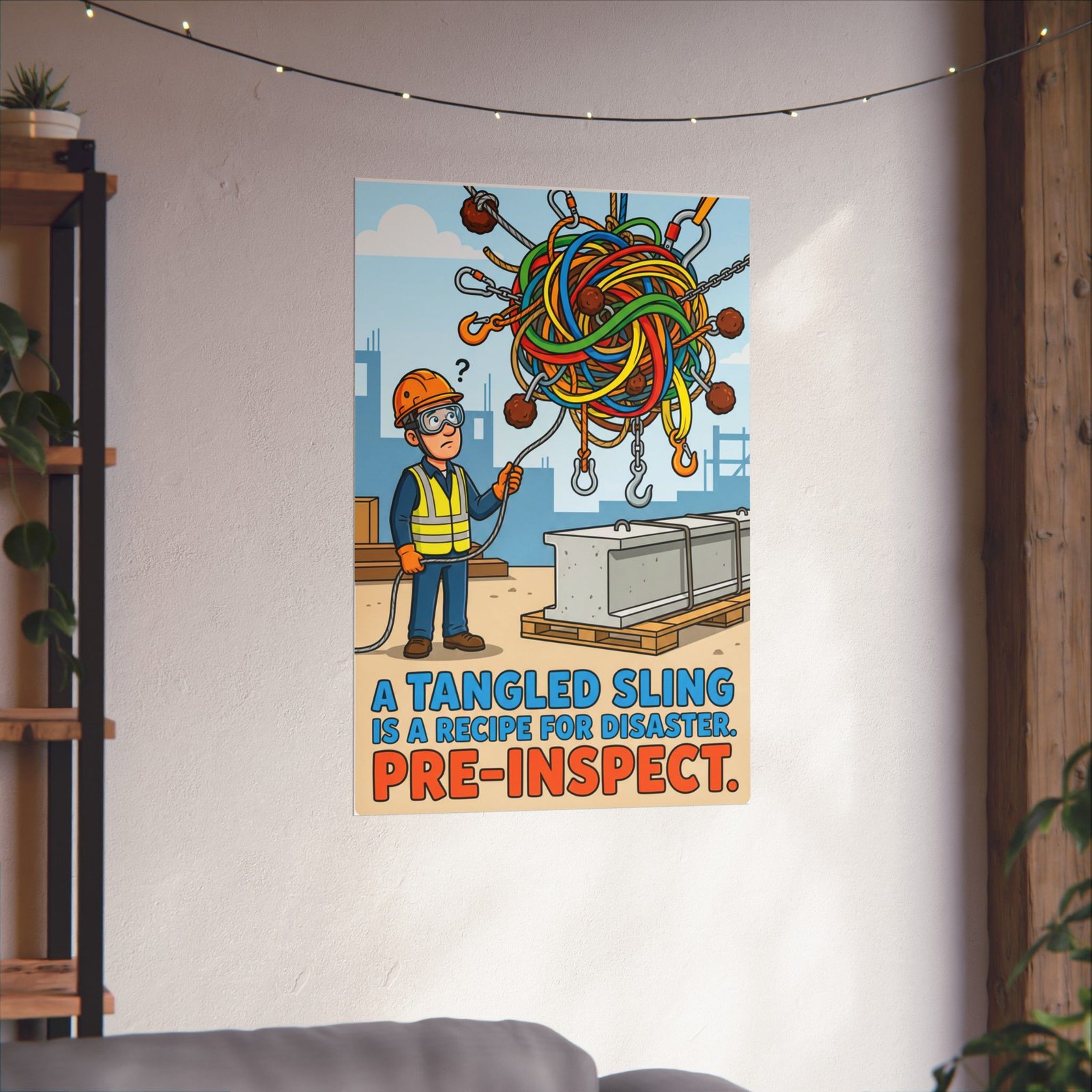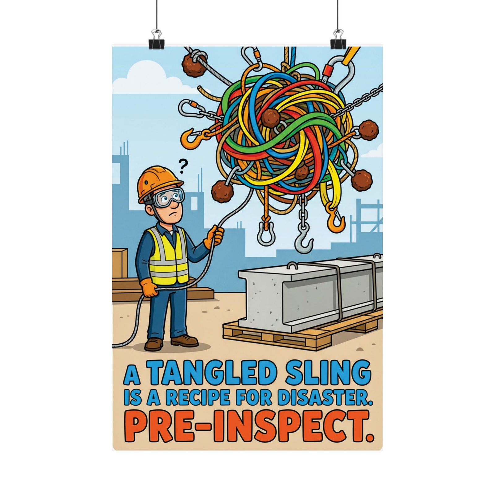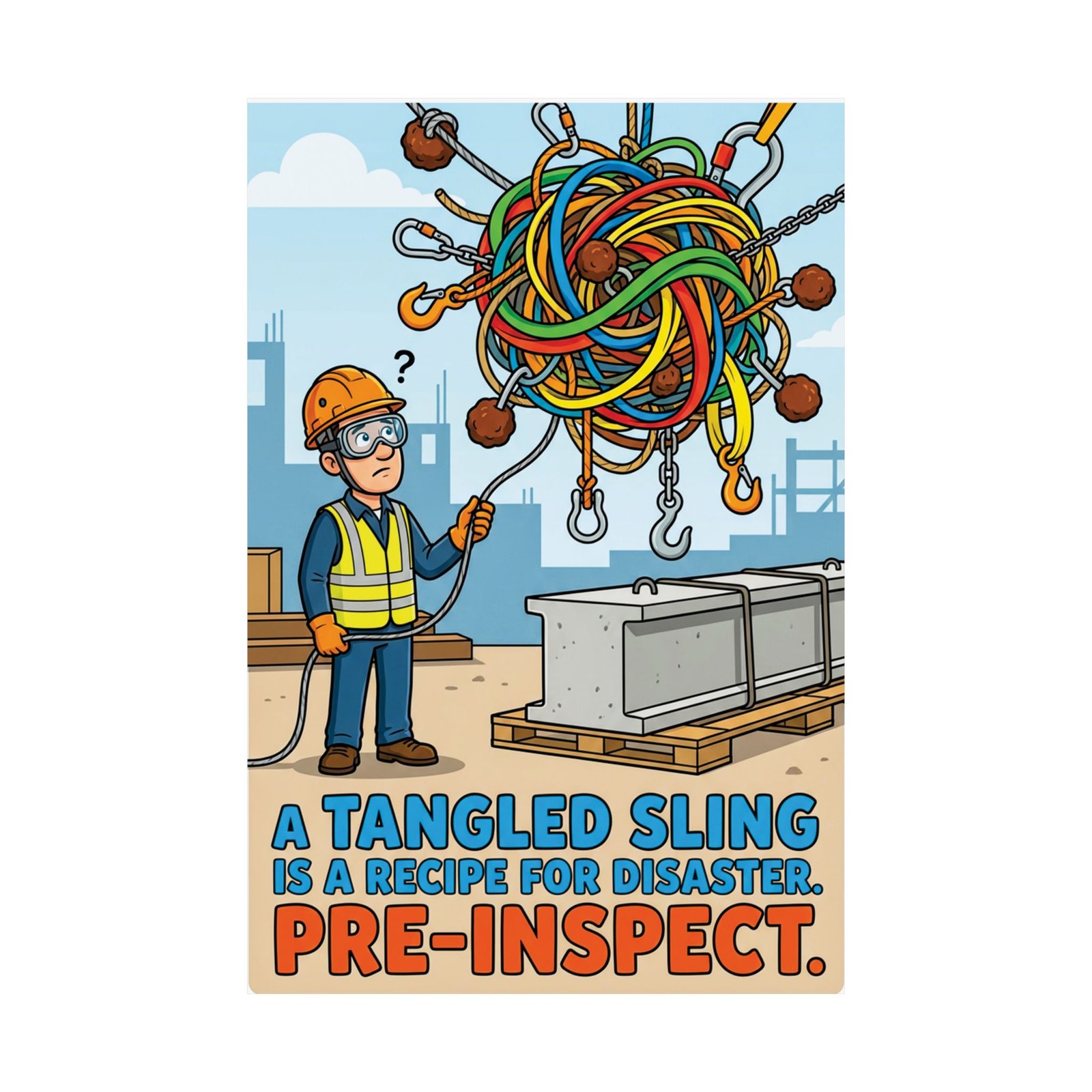 By blending humor with a clear operational reminder, this construction safety poster tangled sling works as both wall art and a functional safety cue. Over time, it becomes a familiar visual prompt that encourages crews to slow down, inspect rigging properly, and prevent avoidable lifting incidents before they happen.