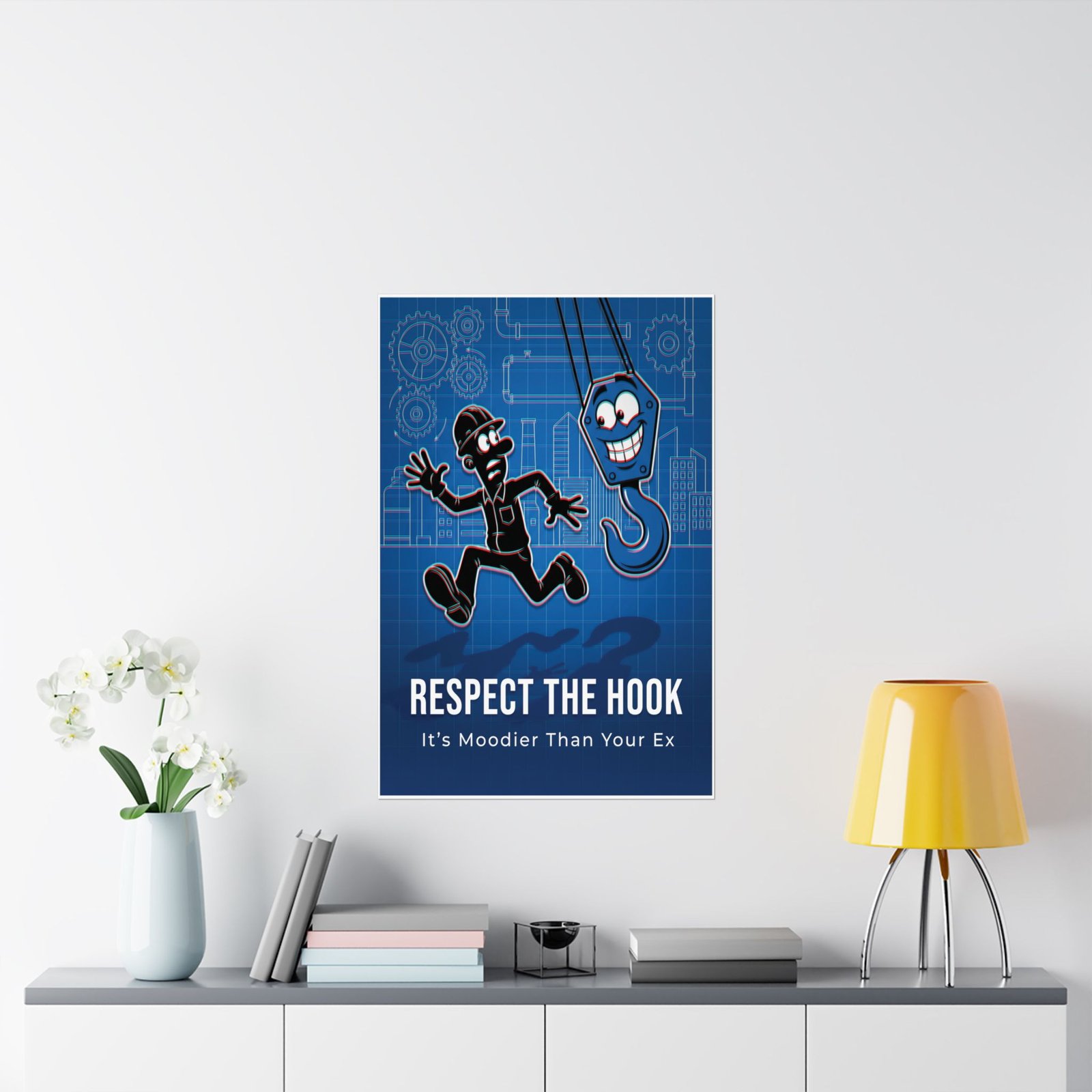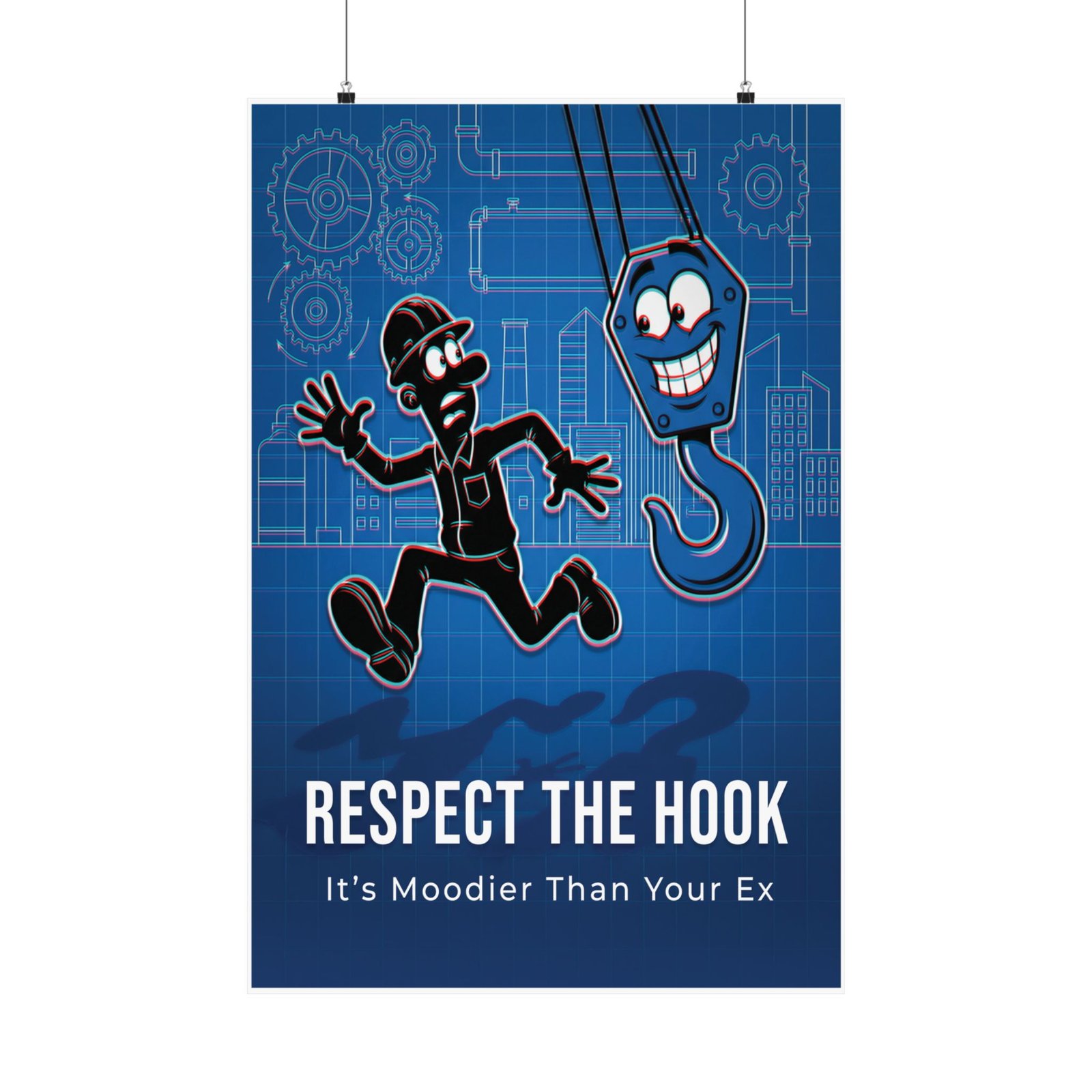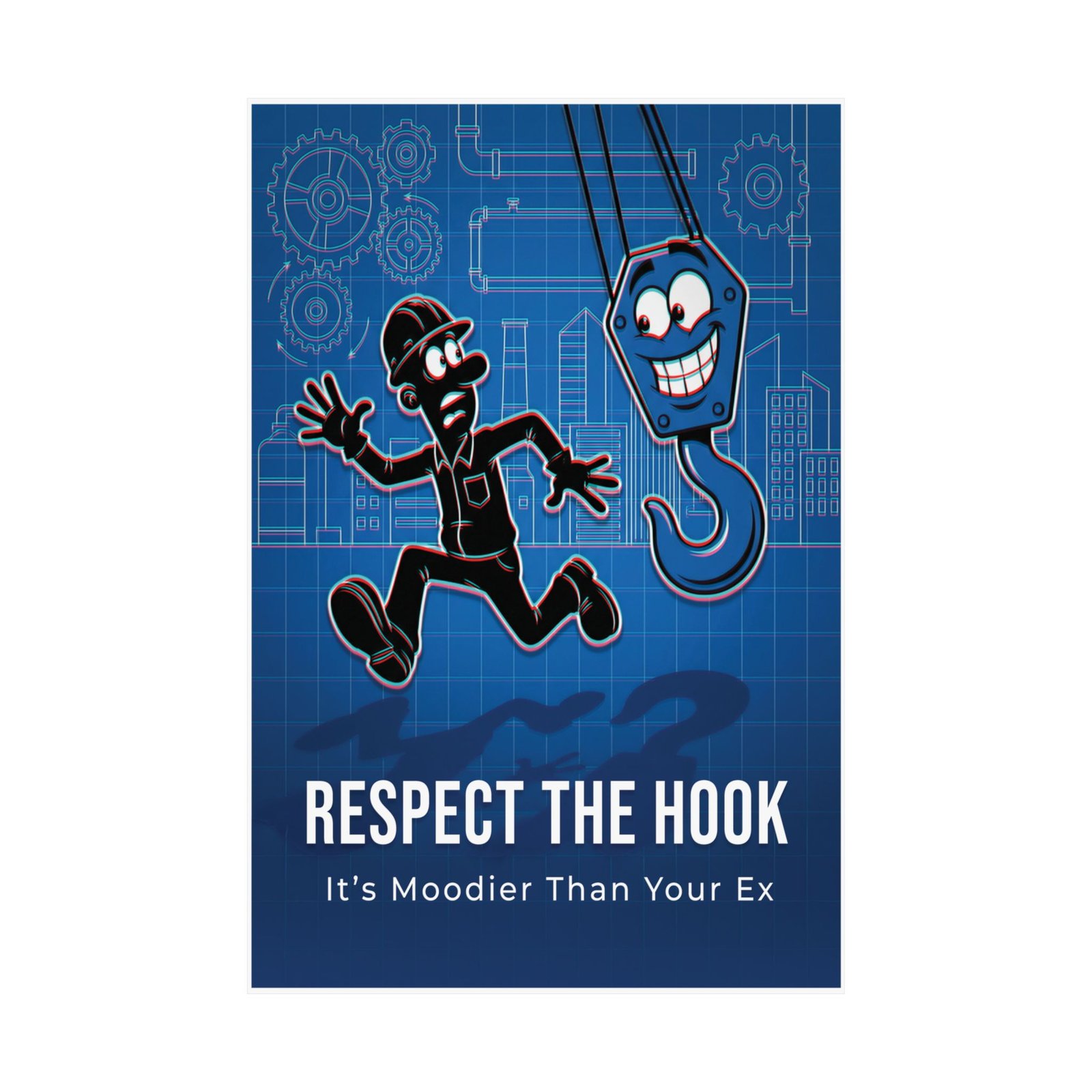 The Respect the Hook Safety Poster brings a sharp, mechanical sense of humour to construction sites, workshops, garages, and industrial workspaces where crane safety and jobsite awareness matter. Designed in blueprint-blue tones with playful cartoon line art, the poster features a grinning crane hook, a startled worker, and the bold message: “RESPECT THE HOOK — It’s Moodier Than Your Ex.” The result is a safety reminder that captures attention without feeling generic or preachy.