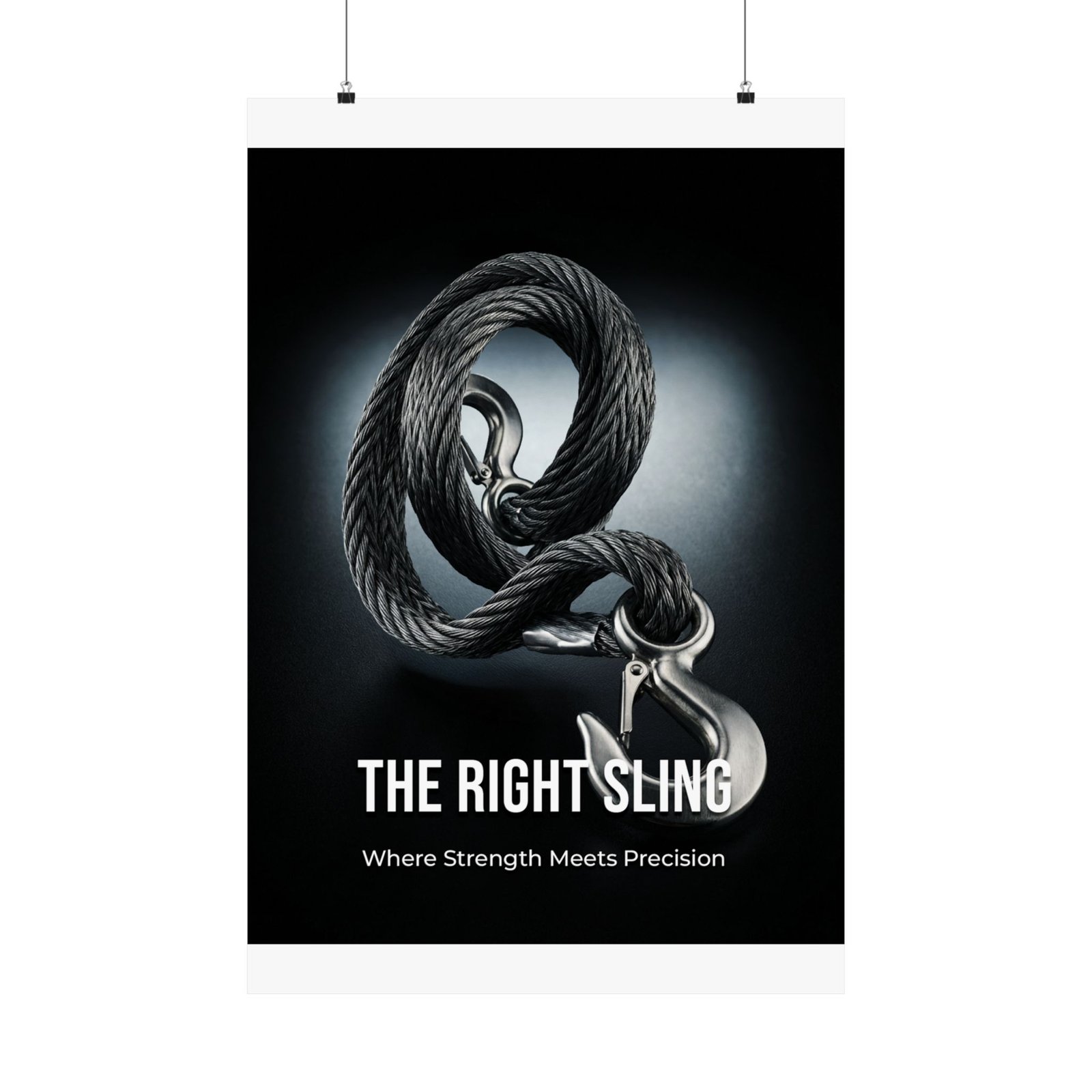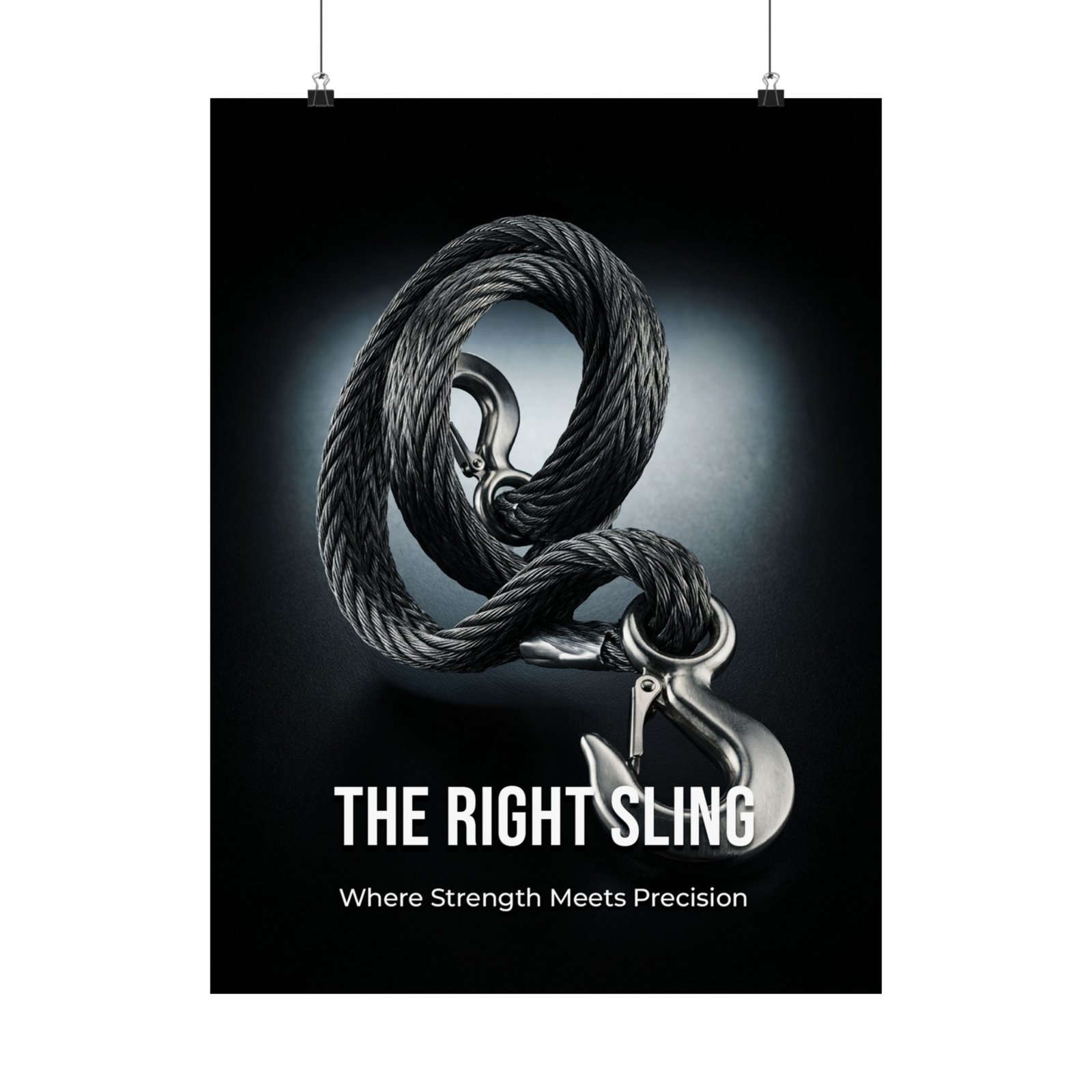 The Right Sling poster highlights the importance of choosing the correct lifting equipment before a load ever leaves the ground. The central image features an industrial-grade sling and hook rendered in rich, high-contrast detail, set against a deep vignette that draws the eye inward. Subtle typography below reads “THE RIGHT SLING” with the line “Where Strength Meets Precision,” reinforcing the idea that safe lifting starts with informed selection.