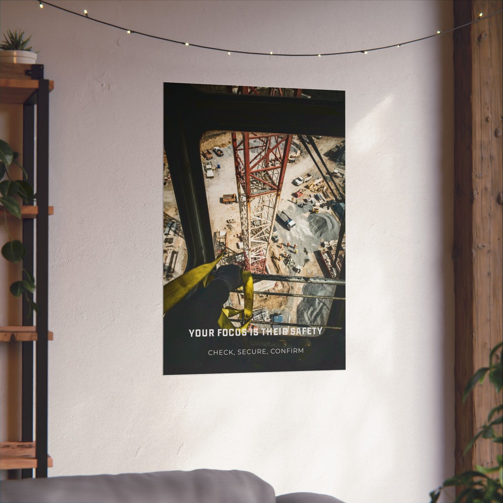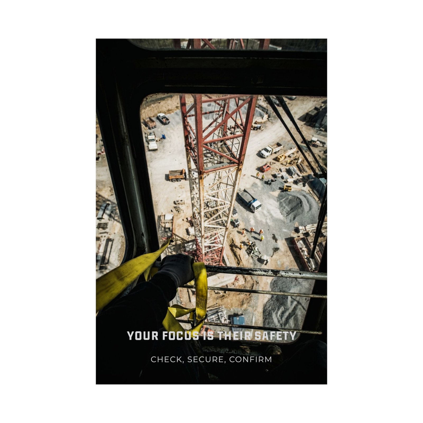 The Your Focus Is Their Safety – Aerial Perspective Poster captures a high-stakes moment from above a construction site, placing the viewer directly in the position of responsibility. Seen through a safety harness and tower crane, the image frames steel, scaffolding, materials, and movement below — a raw reminder that every decision made at height affects others on the ground.