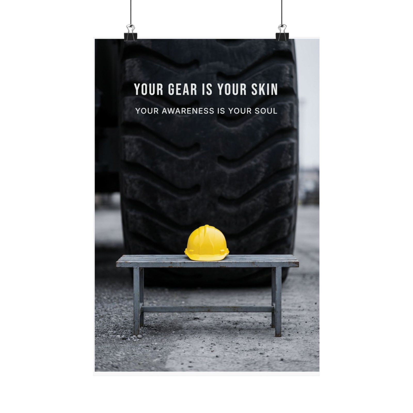 The Your Gear Is Your Skin Poster delivers a direct yet thoughtful message about responsibility, awareness, and protection in crane and construction environments. The composition is simple but weighted: a large industrial tire fills the background in muted greys, while a single yellow hard hat rests on a weathered bench. The contrast draws the eye and reinforces the idea that safety gear is not optional—it is an extension of the person wearing it.