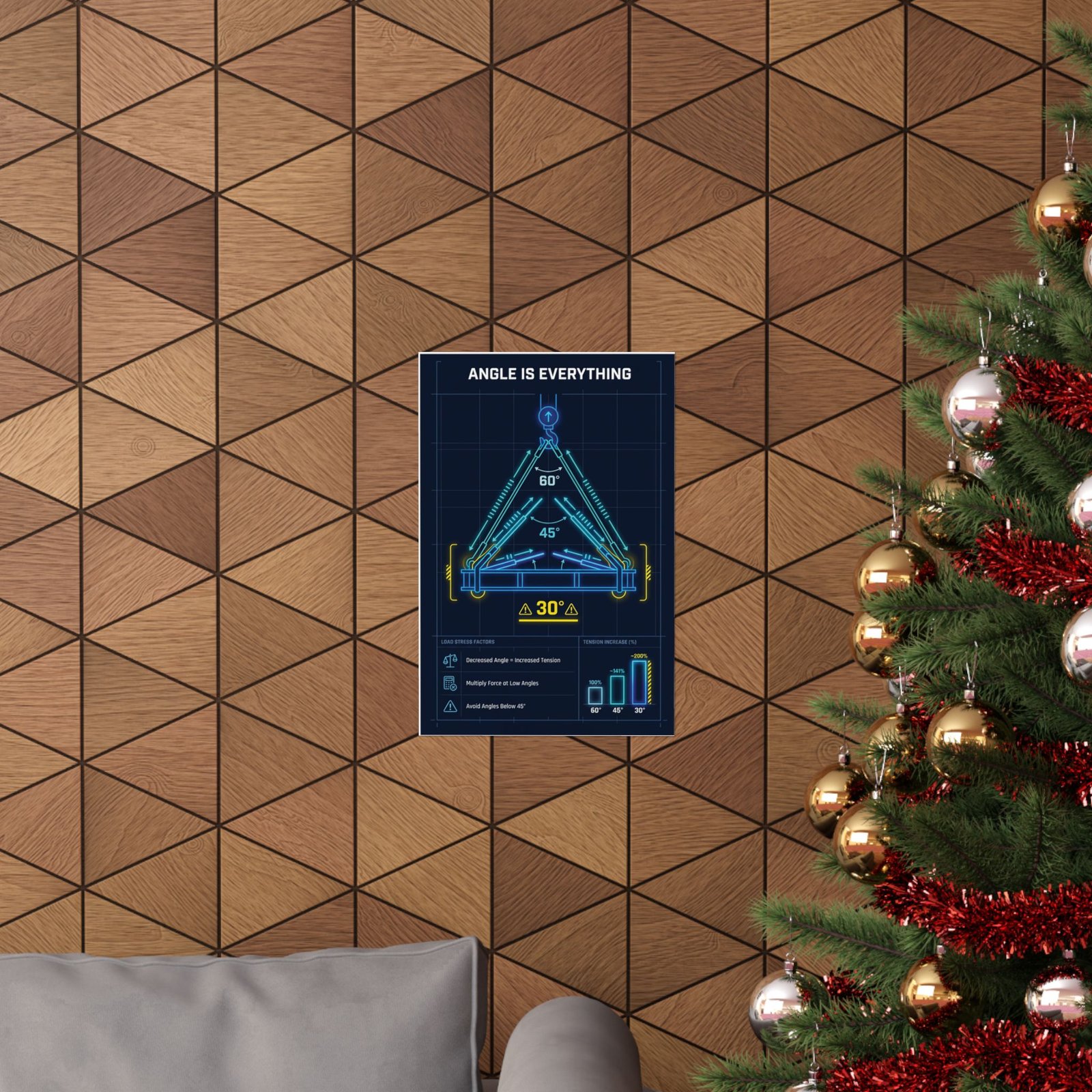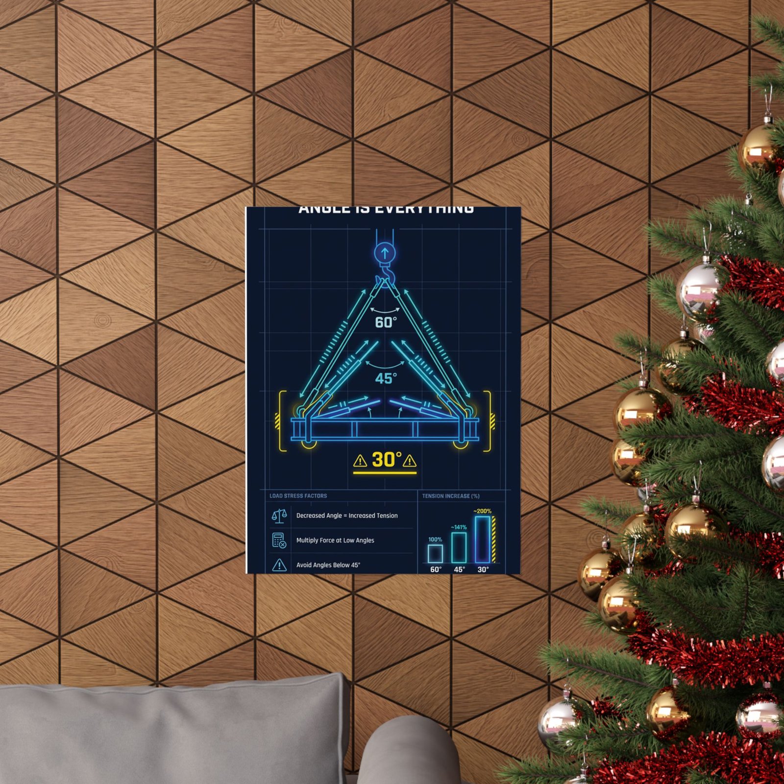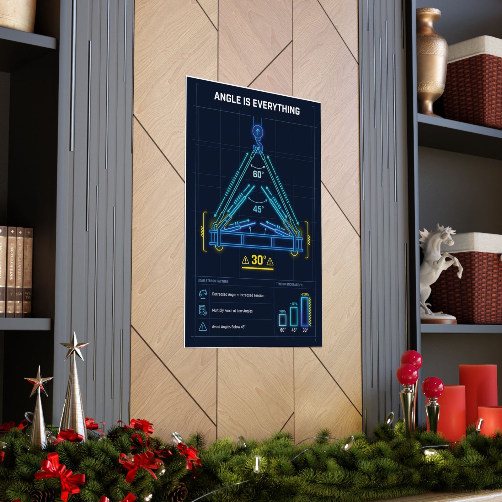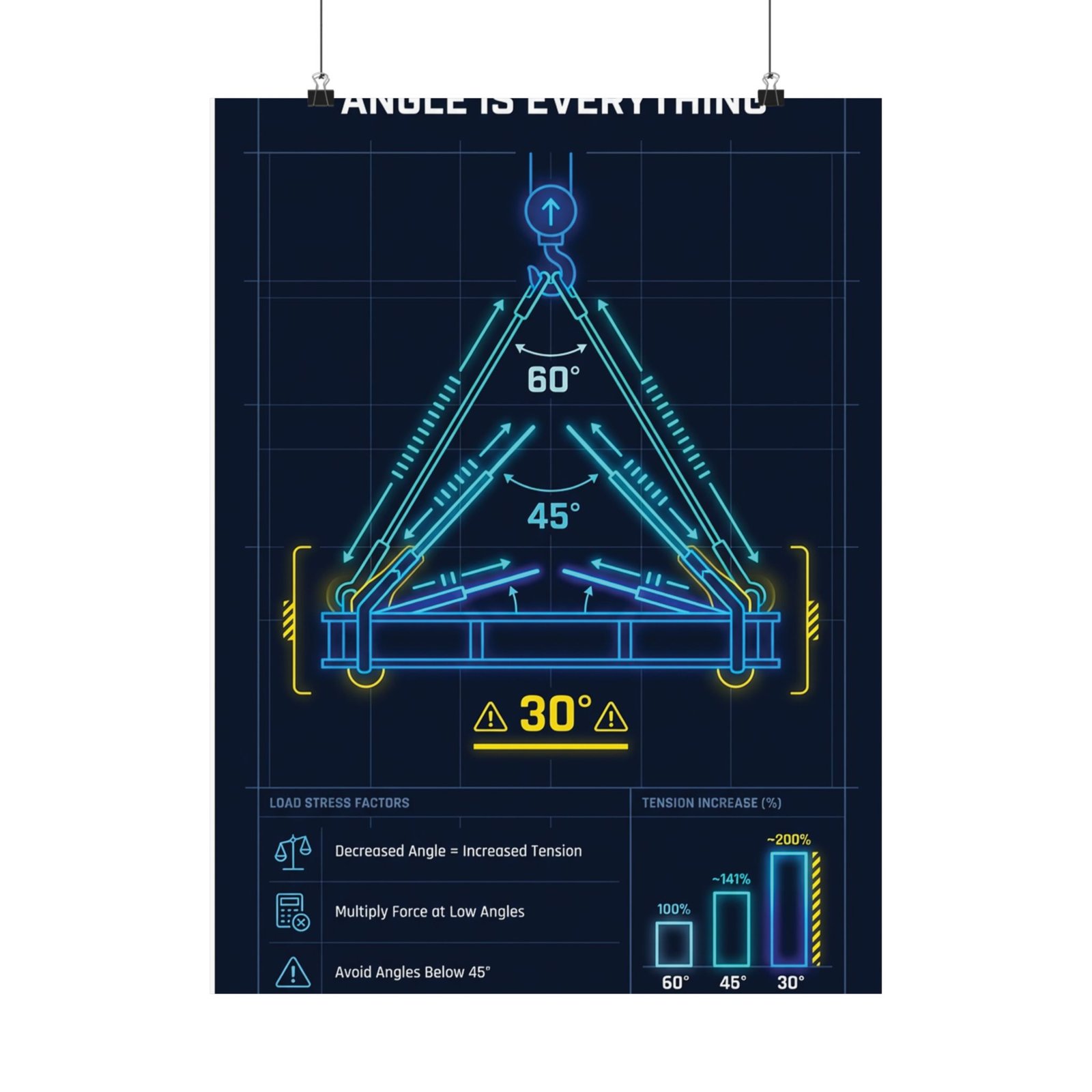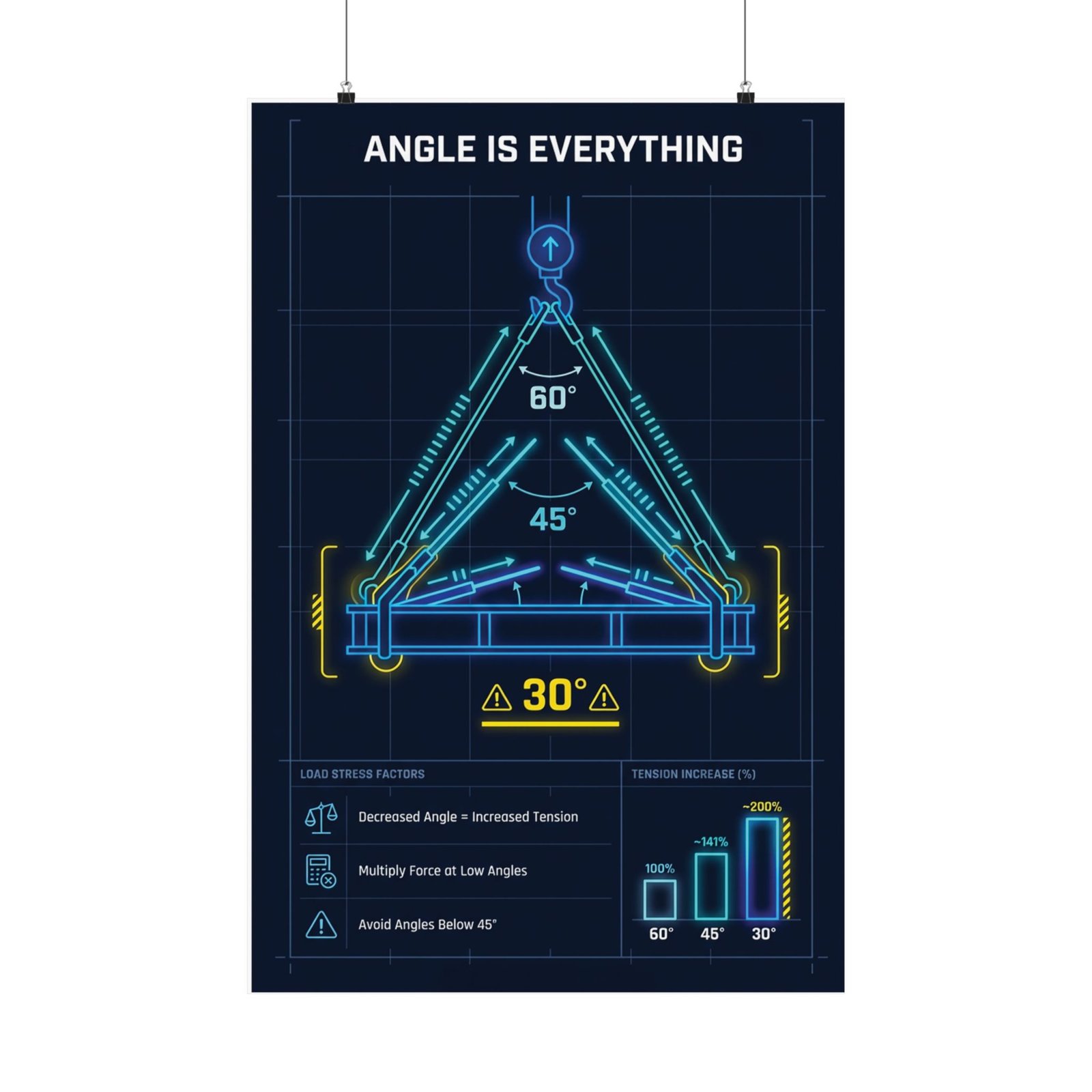 Printed on museum-grade archival paper using high-quality giclée inks, the angle is everything decrease angle increase tension poster delivers crisp linework and stable color without glare. The matte finish improves legibility under bright workshop, site office, or training-room lighting, ensuring angle diagrams and force indicators remain easy to read from a distance. Whether mounted near lift plans, inside a crane cab office, or within a training space, this angle is everything decrease angle increase tension poster works as a constant visual reminder of how small changes in sling angle can result in large increases in load stress.