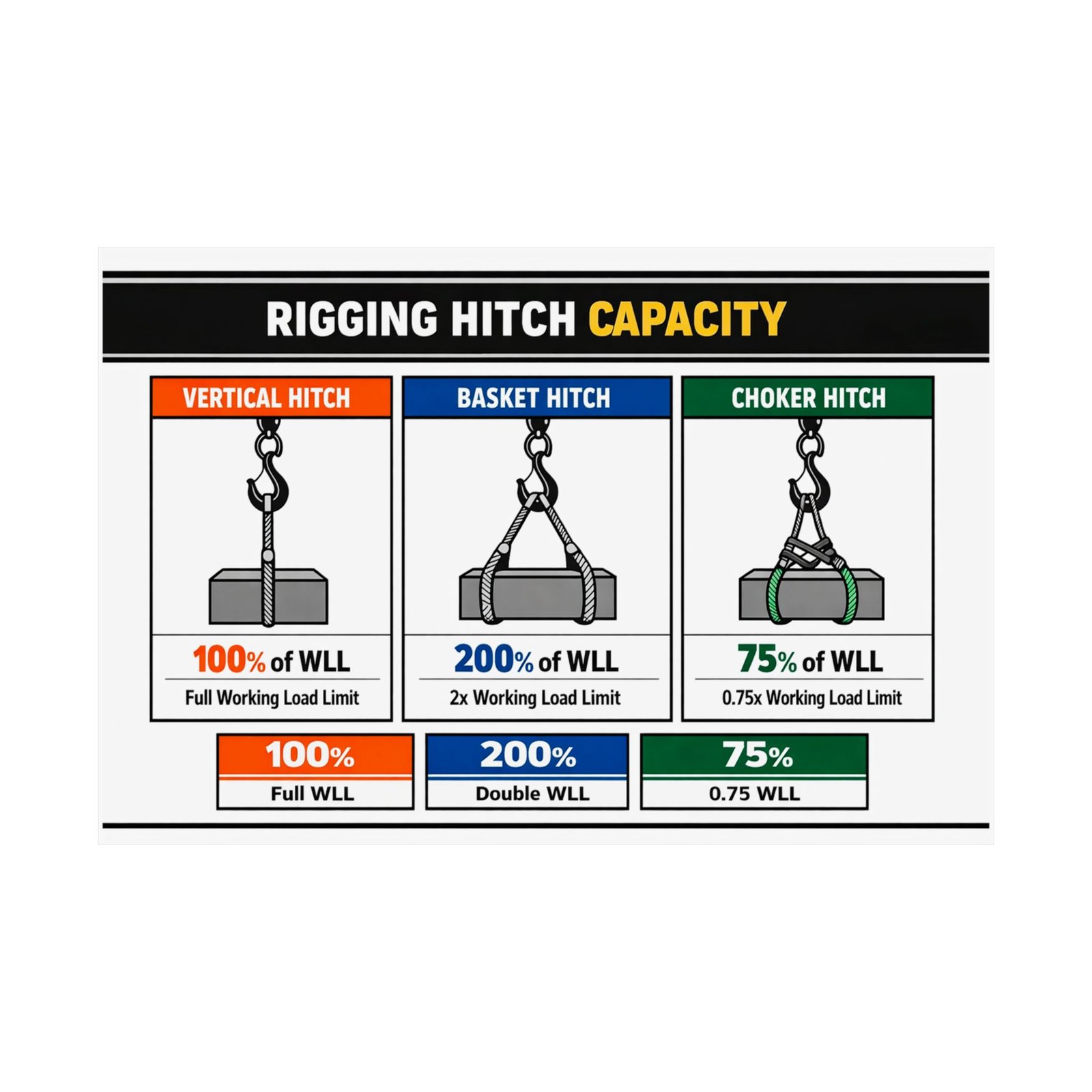 Instant WLL Reference: Clearly illustrates why a basket hitch provides 200% capacity while a choker hitch reduces safe lifting limits to 75%.