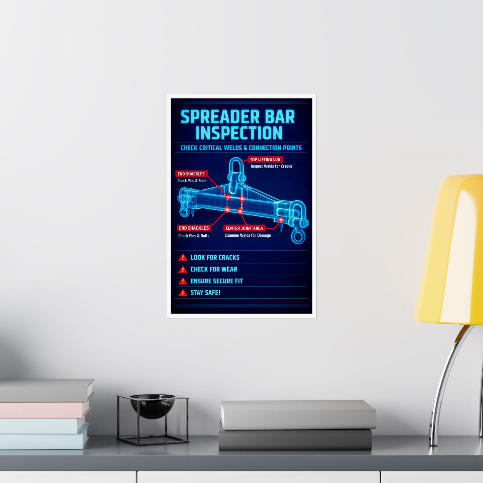 This spreader bar inspection safety poster is printed on 175–189 g/m² heavyweight archival paper with a premium matte finish. We chose this blueprint-style aesthetic to establish instant engineering credibility in professional environments. The matte, light-absorbing surface ensures that the glowing red stress markers and technical labels remain sharp and legible under the harsh overhead lighting of a maintenance workshop or rigging station. Using Giclée printing technology, the deep industrial blue and neon cyan lines stay vibrant and fade-resistant, providing an audit-ready spreader bar inspection safety poster that outlasts standard paper signage.