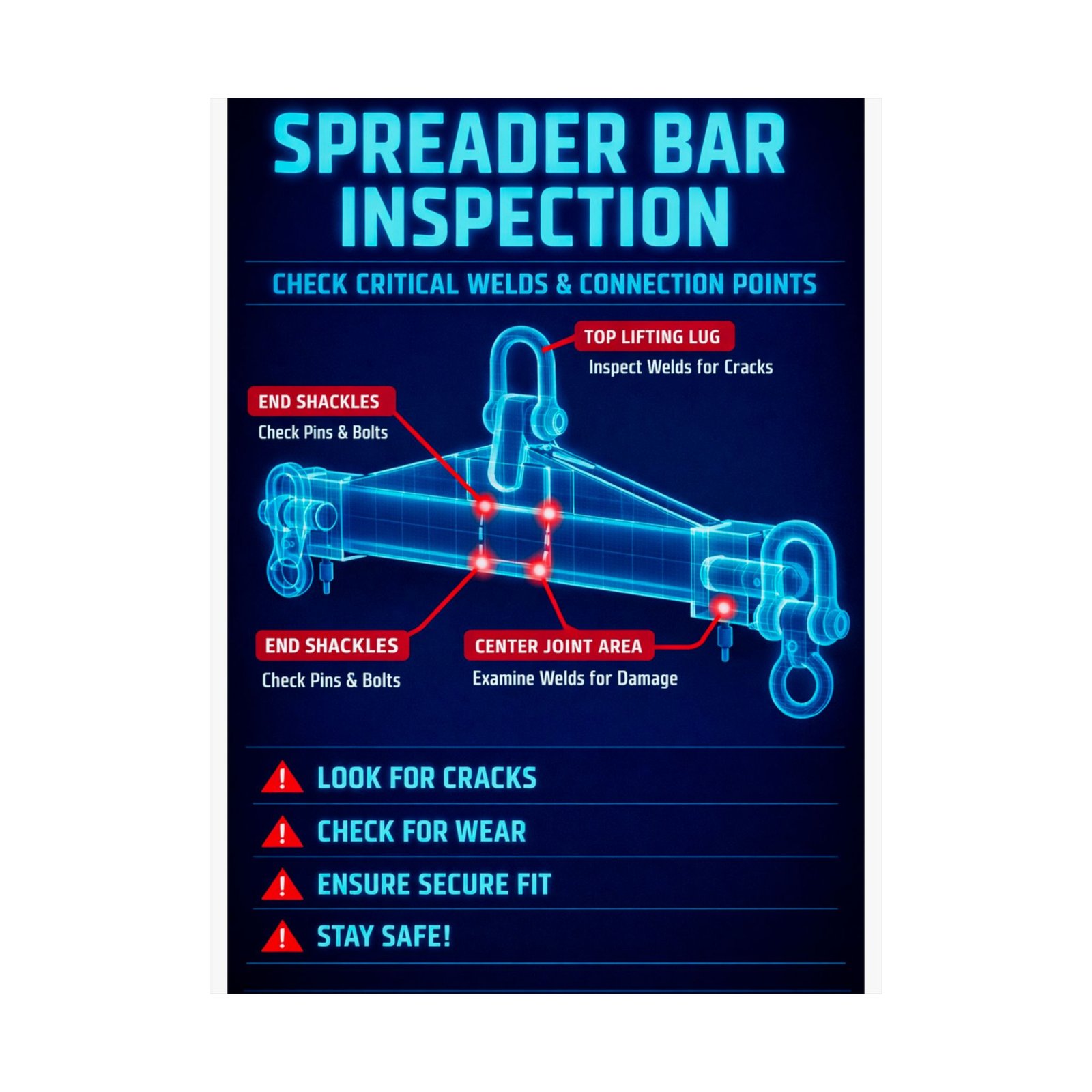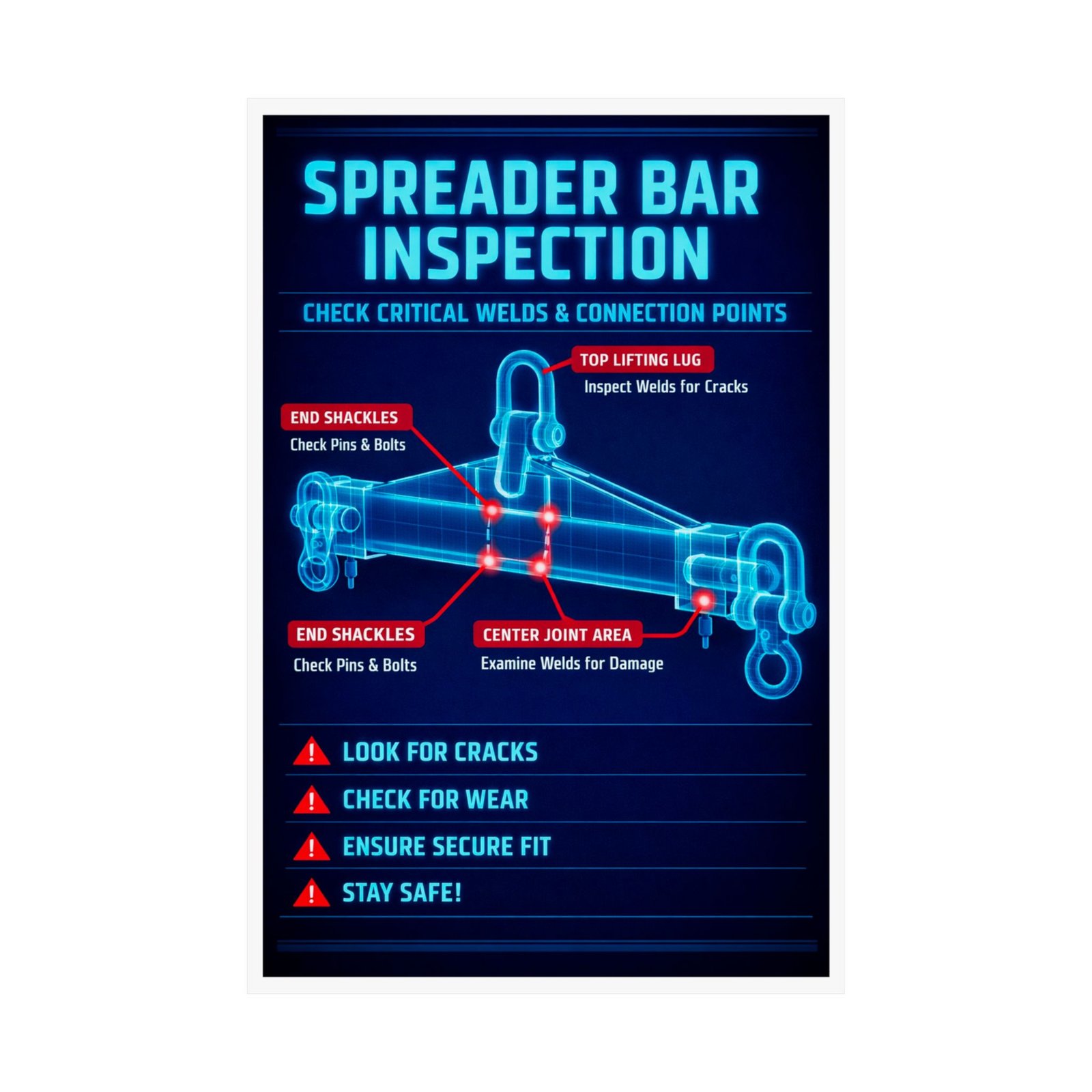 Maintain the structural integrity of your lifting equipment with the spreader bar inspection safety poster. Featuring a high-contrast blueprint diagnostic design, this poster provides an X-ray view of critical stress points, including top lifting lugs, center welded joints, and end shackles. By highlighting high-risk areas for fatigue cracks and pin wear, this inspection safety poster acts as a persistent technical supervisor, ensuring your crew performs rigorous pre-lift checks on every spreader bar and lifting beam in your fleet.