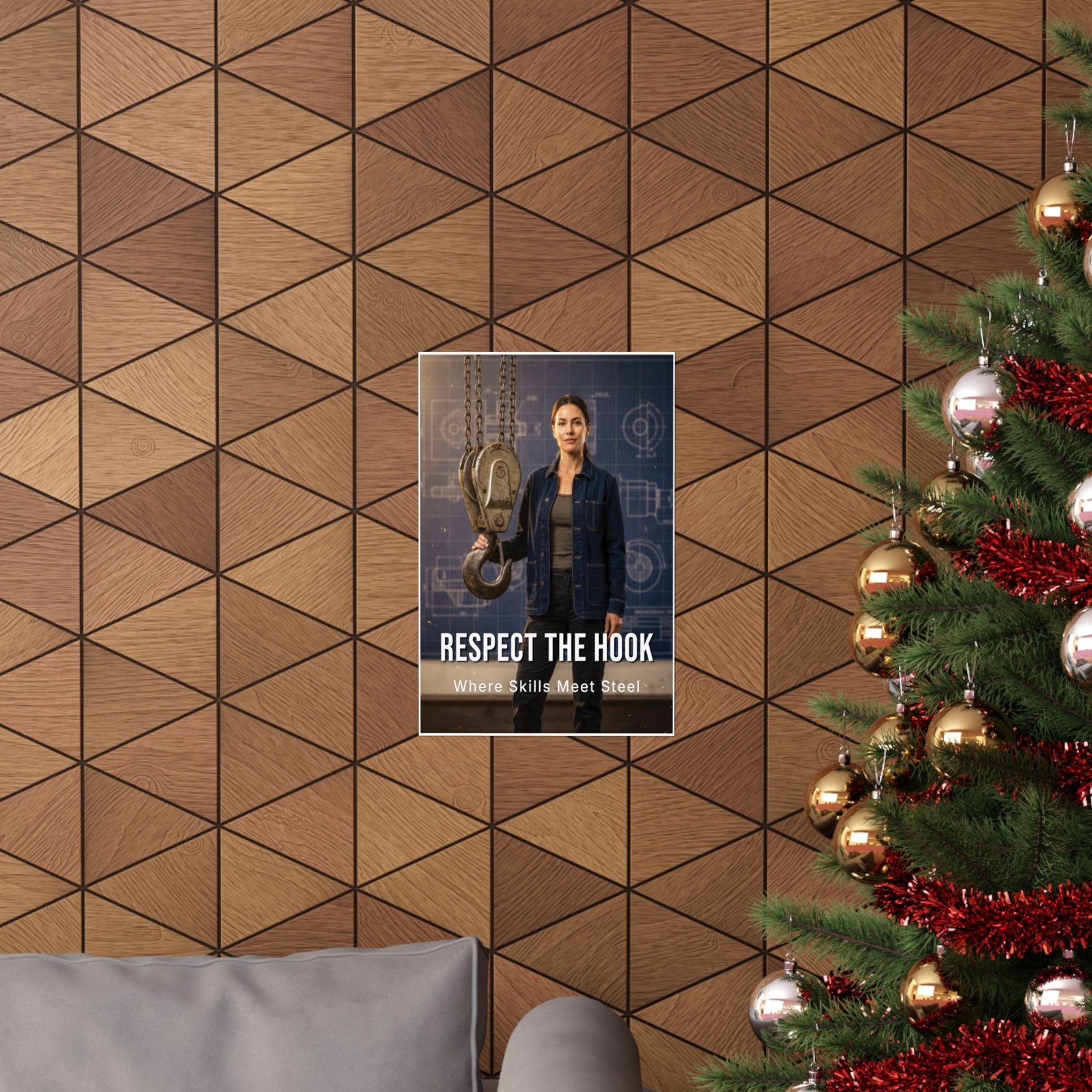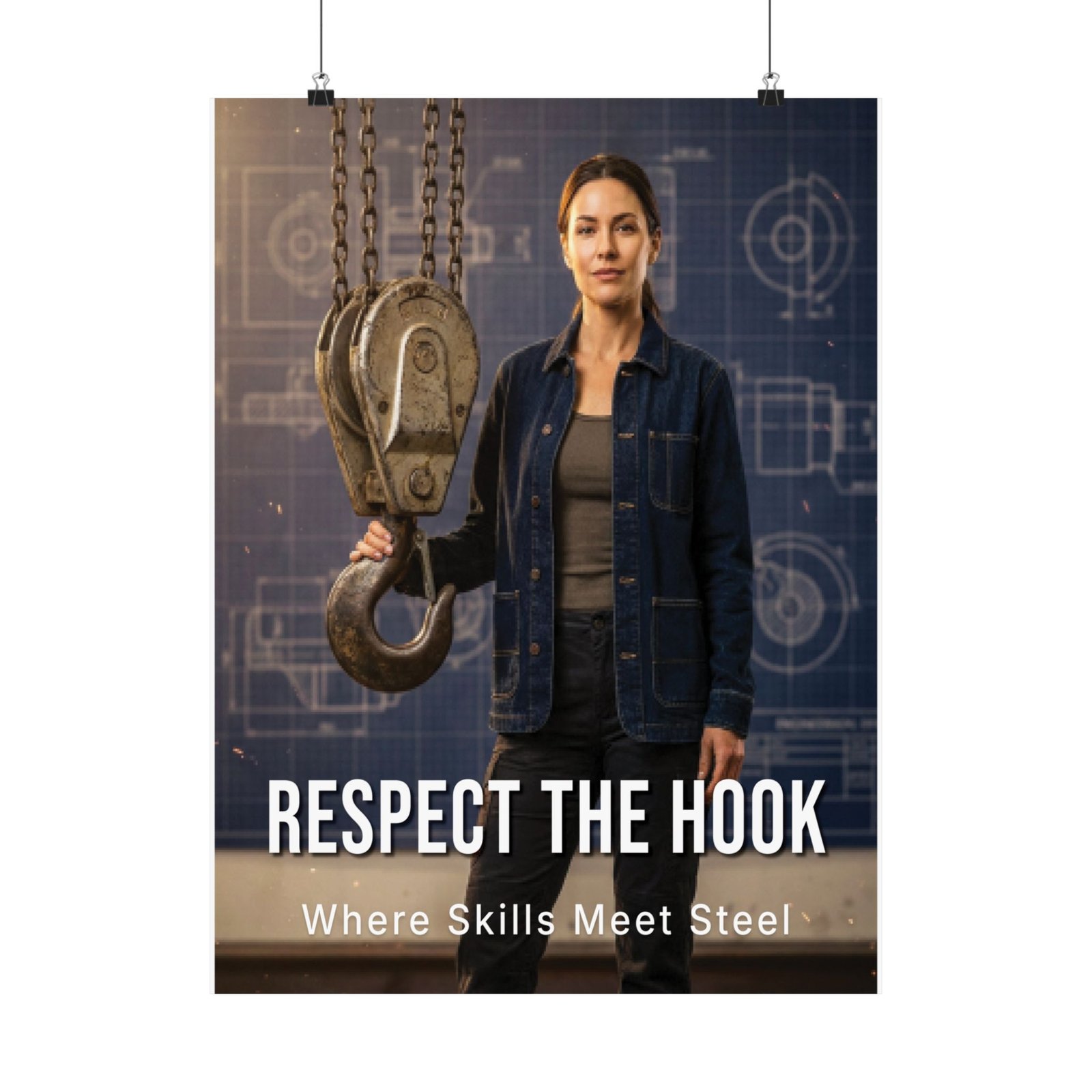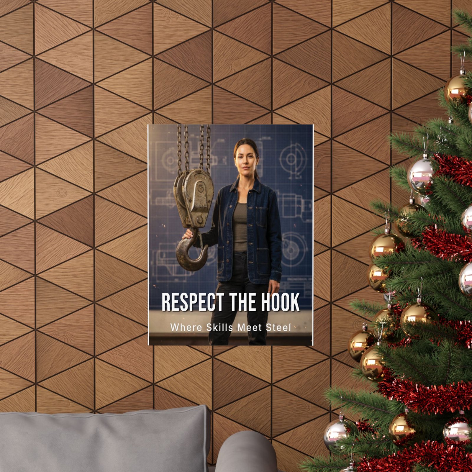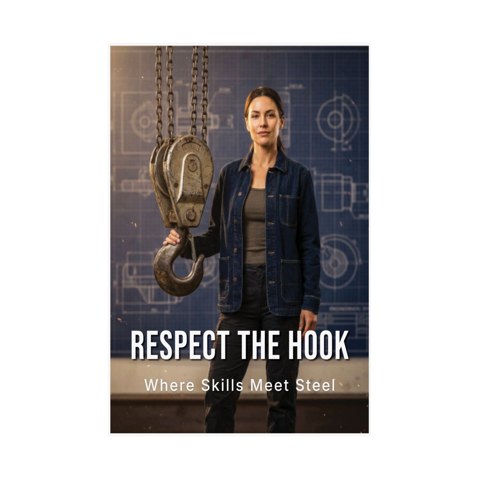 Where Skills Meet Steel Poster is a matte vertical wall print that honors hands-on craftsmanship, mechanical confidence, and the quiet authority of skilled work. The image features a confident tradesperson standing beside a heavy industrial lifting hook, layered with subtle blueprint elements that reference precision, planning, and engineering discipline. The headline — “Respect the Hook — Where Skills Meet Steel” — reinforces pride in technique rather than brute force.