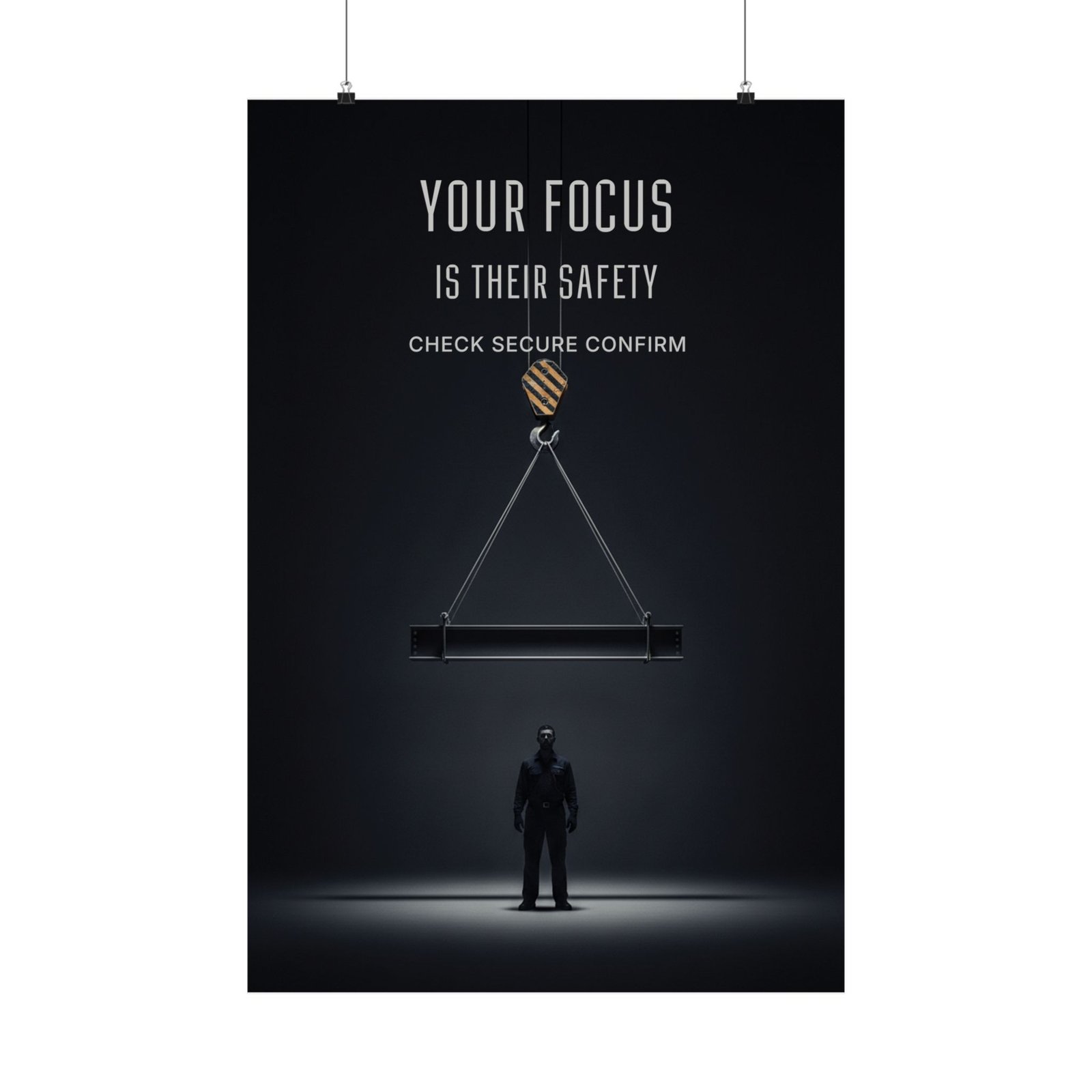 This decisive crane safety focus poster PDF strips the message down to what matters most: one lift, one operator, one responsibility. The minimalist composition — a suspended load above a lone figure — visually reinforces the weight of focus and consequence in crane operations.