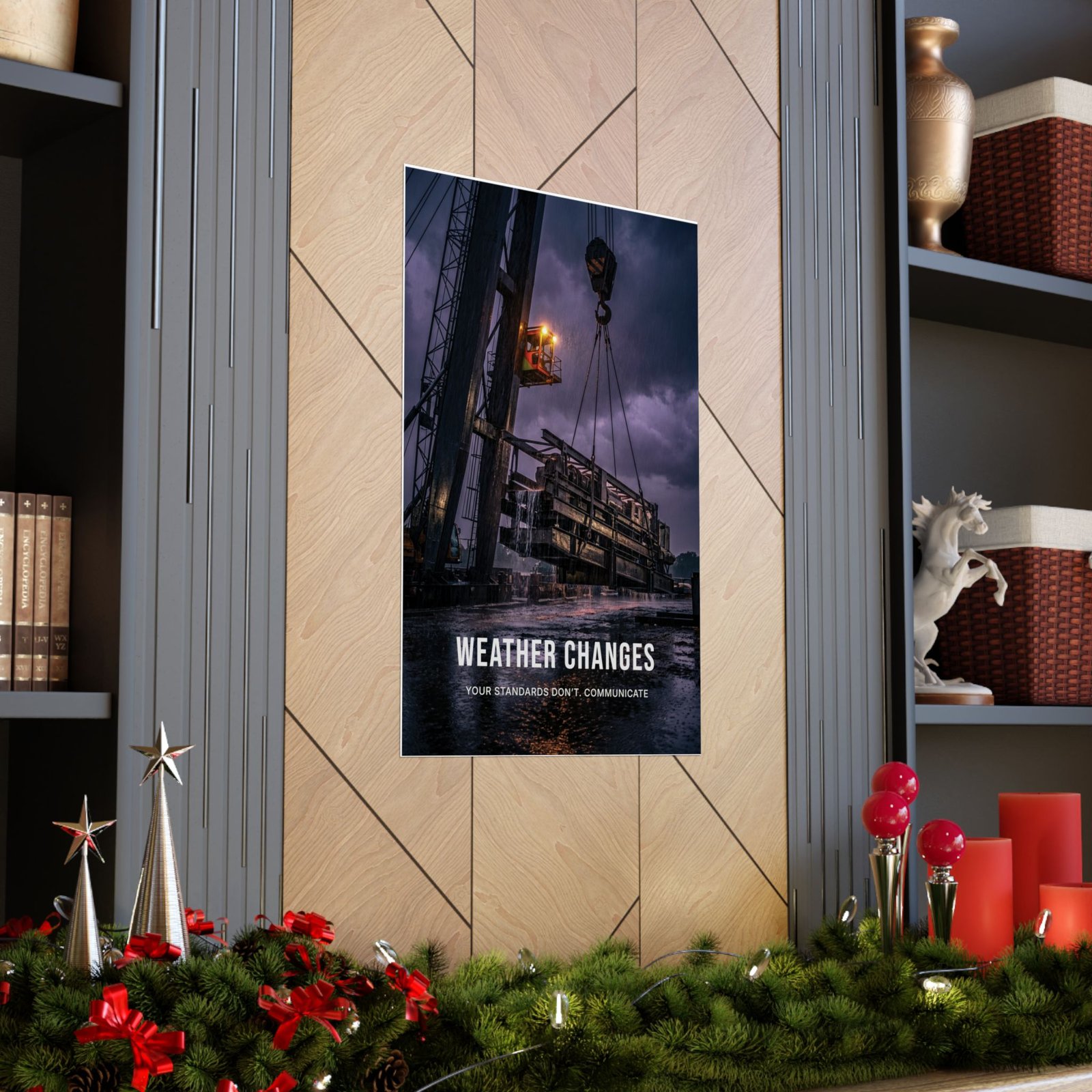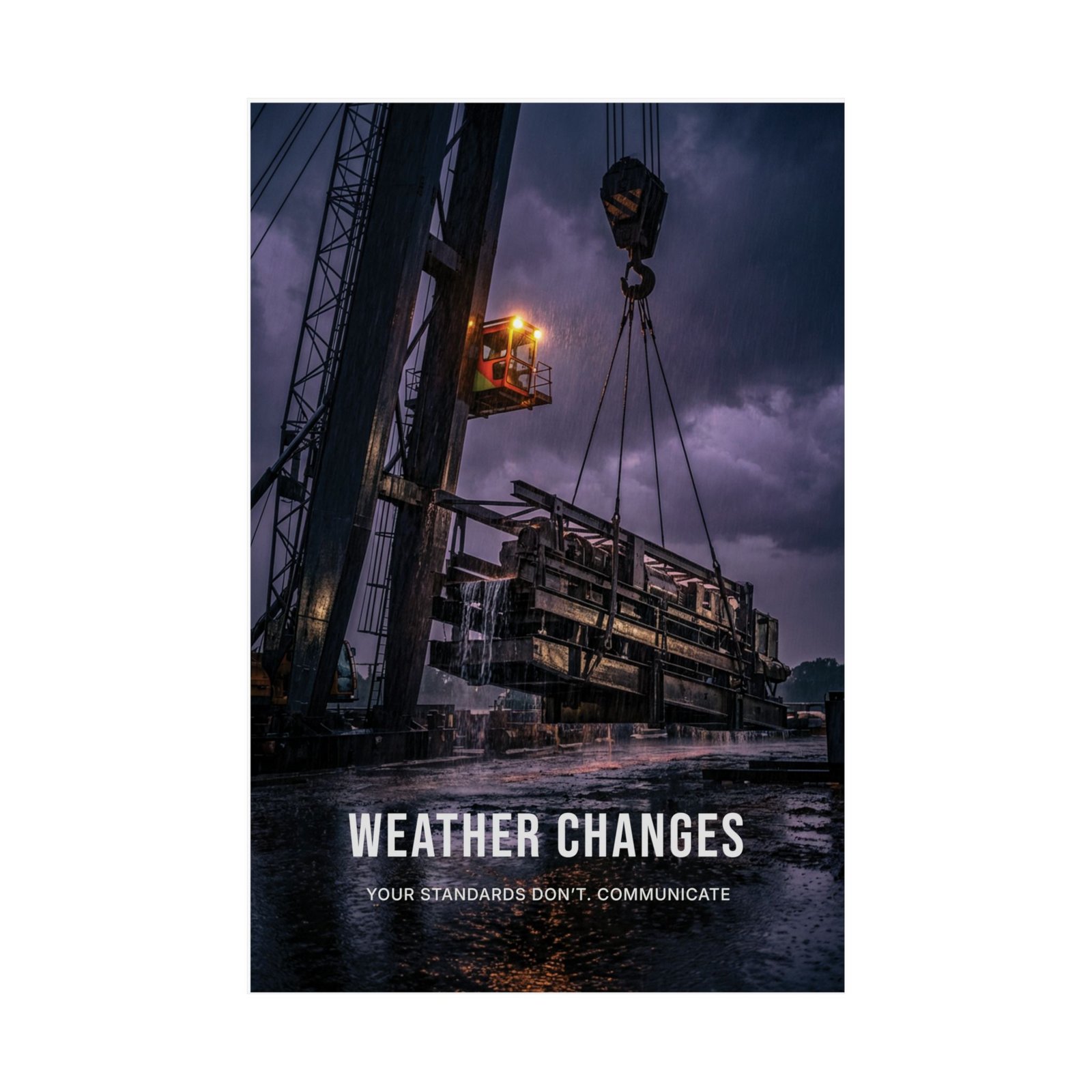 Weather Changes Safety Poster highlighting the impact of shifting conditions on construction sites. A moody construction safety poster promoting jobsite weather awareness.