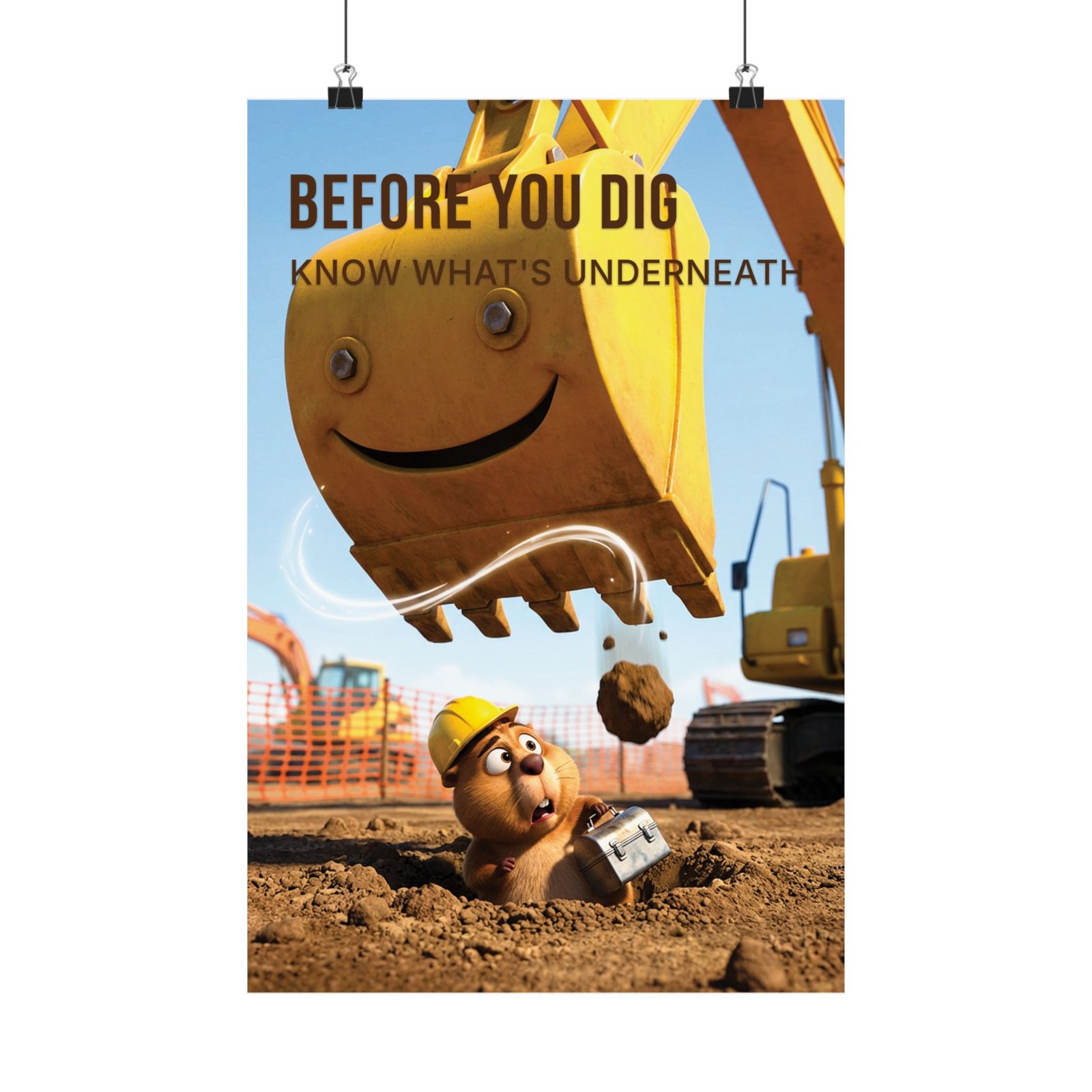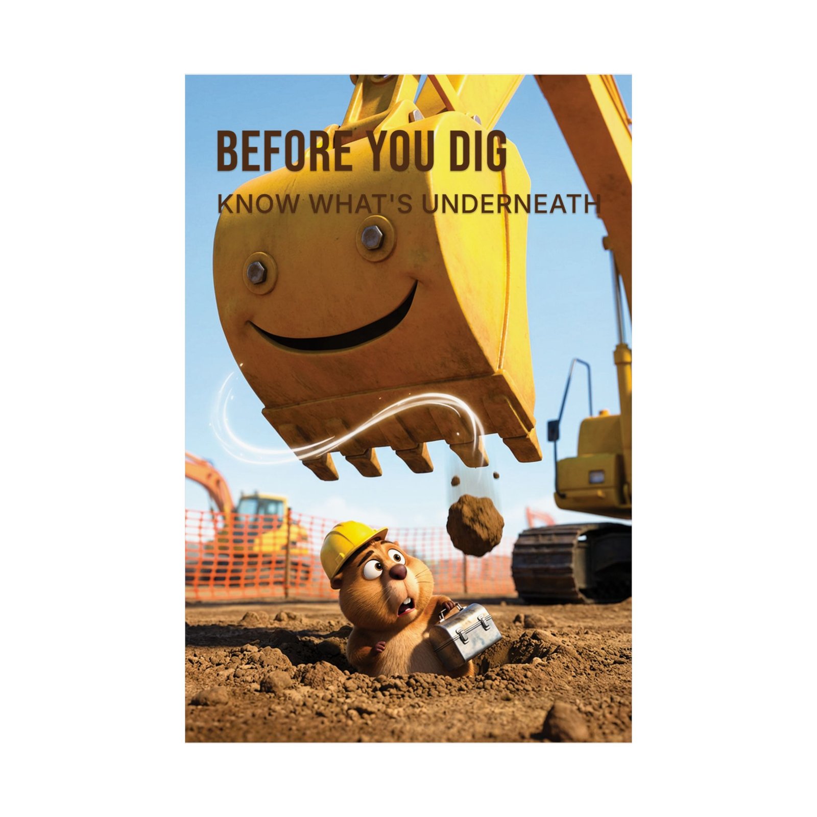 A construction safety poster before you dig design that uses humor to remind crews to check what’s beneath the surface before excavation.