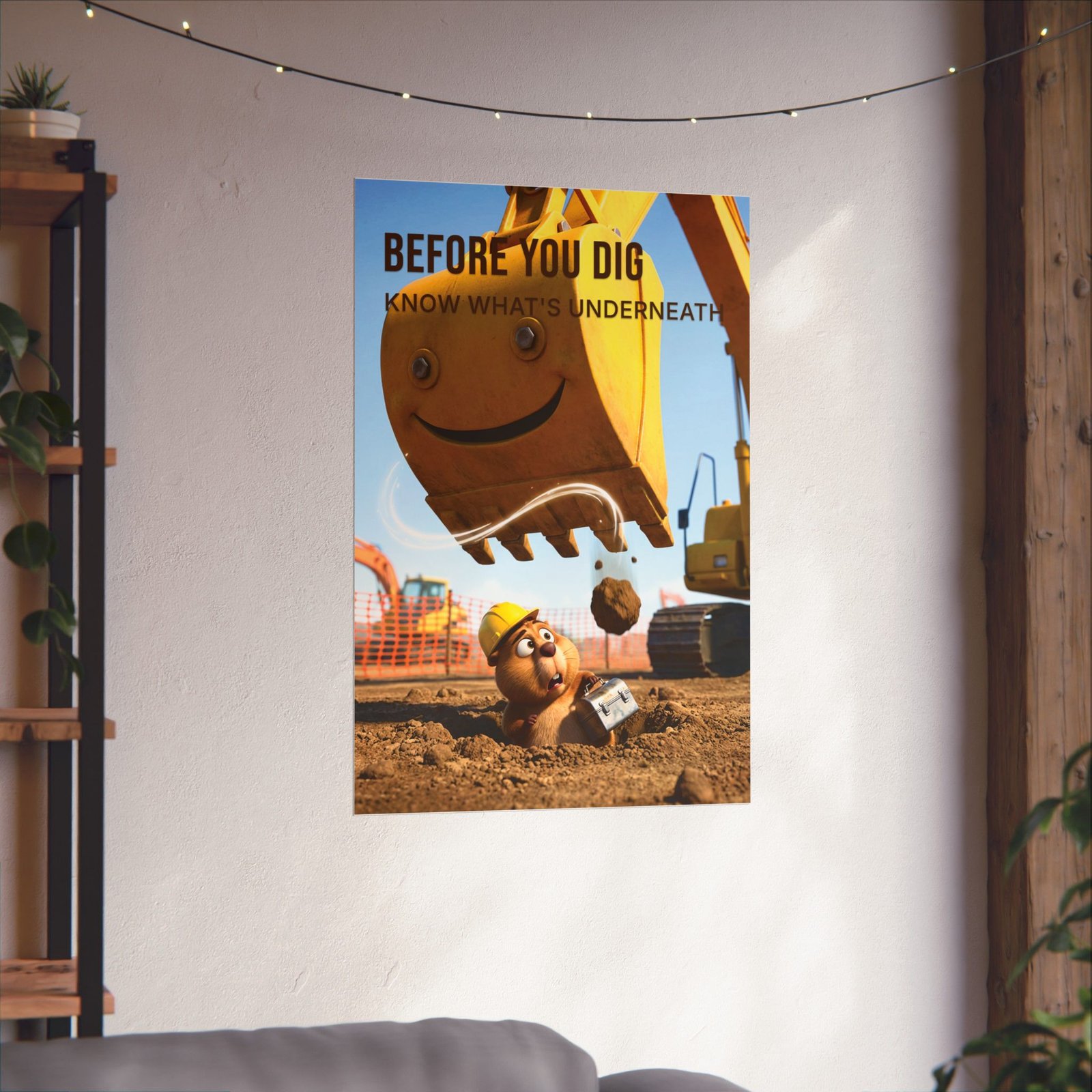 Because it blends construction humor with practical awareness, this construction safety poster before you dig works as both wall art and a functional reminder. Over time, it becomes a familiar visual cue that reinforces safer excavation habits through repetition, recognition, and a moment of shared humor