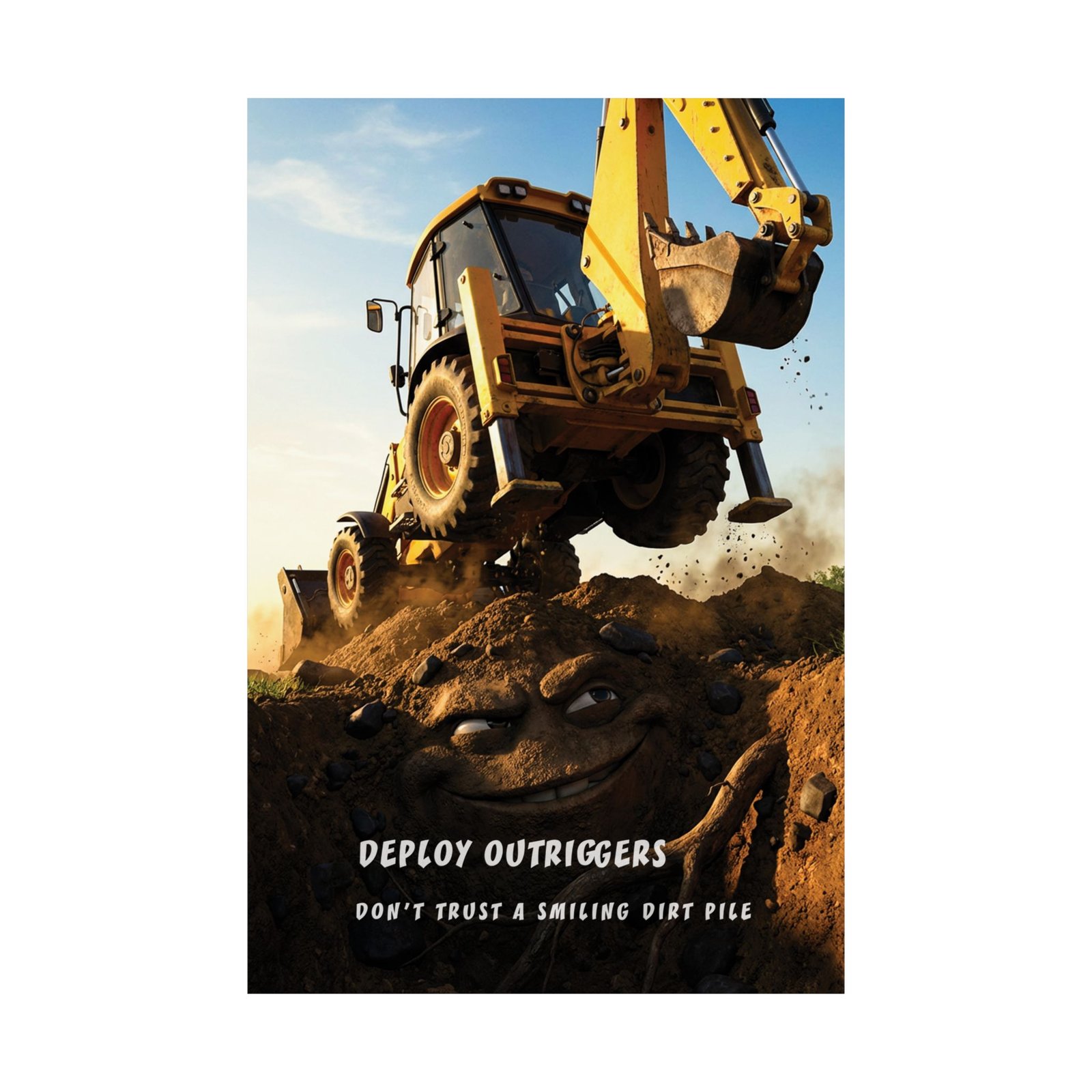 This construction safety poster deploy outriggers combines humor and visual storytelling to reinforce a critical lesson about equipment stability. The artwork shows a backhoe climbing an unstable dirt pile with a mischievous “smiling” face, paired with the clear message: “Deploy Outriggers — Don’t trust a smiling dirt pile.” The playful tone makes the warning memorable while still delivering a serious point about safe machine setup.