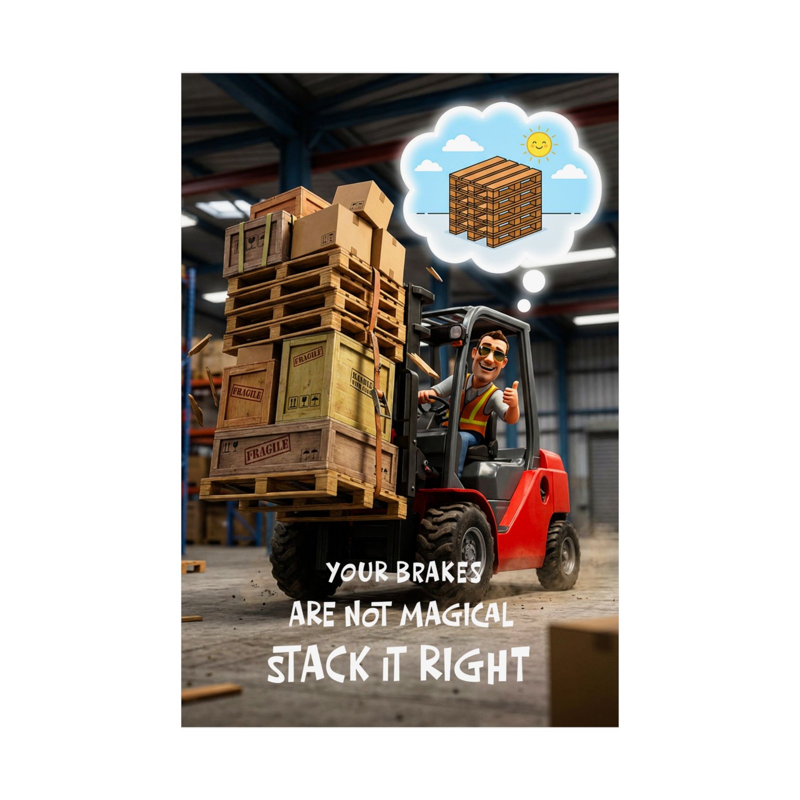 Because it blends warehouse humor with real-world safety awareness, this construction safety poster stack it right works as both wall art and a practical reminder. Over time, it becomes part of the environment — a familiar visual cue that helps reinforce proper stacking, controlled braking, and safer forklift operation across the workplace.