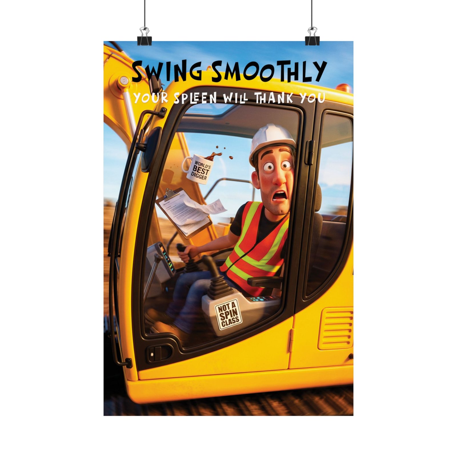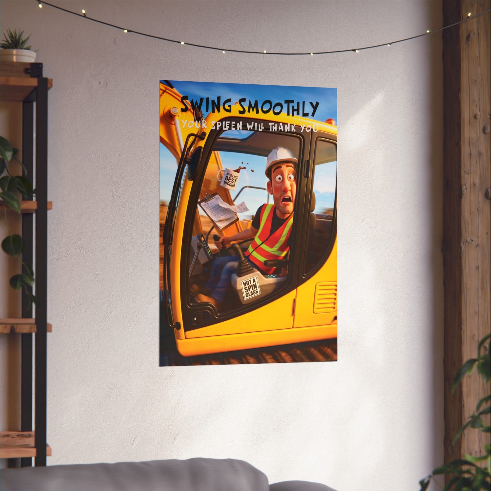 Because it blends lighthearted humor with a real operational lesson, this construction safety poster swing smoothly works as both wall art and a practical reminder. It quietly reinforces better habits around machine control, reminding operators that smooth movement protects both equipment and the body.