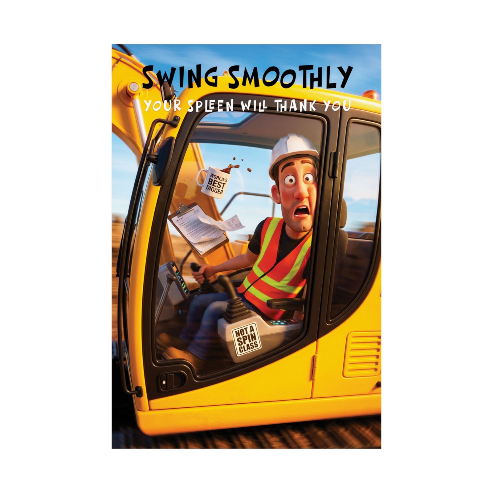 This construction safety poster swing smoothly uses humor and visual storytelling to highlight the importance of controlled machine movement on the jobsite. The artwork shows a startled operator inside a bright yellow cab, mid-swing, capturing the split second when poor control turns into discomfort. The bold line “Swing smoothly — your spine will thank you” delivers a clear reminder without sounding instructional or harsh.