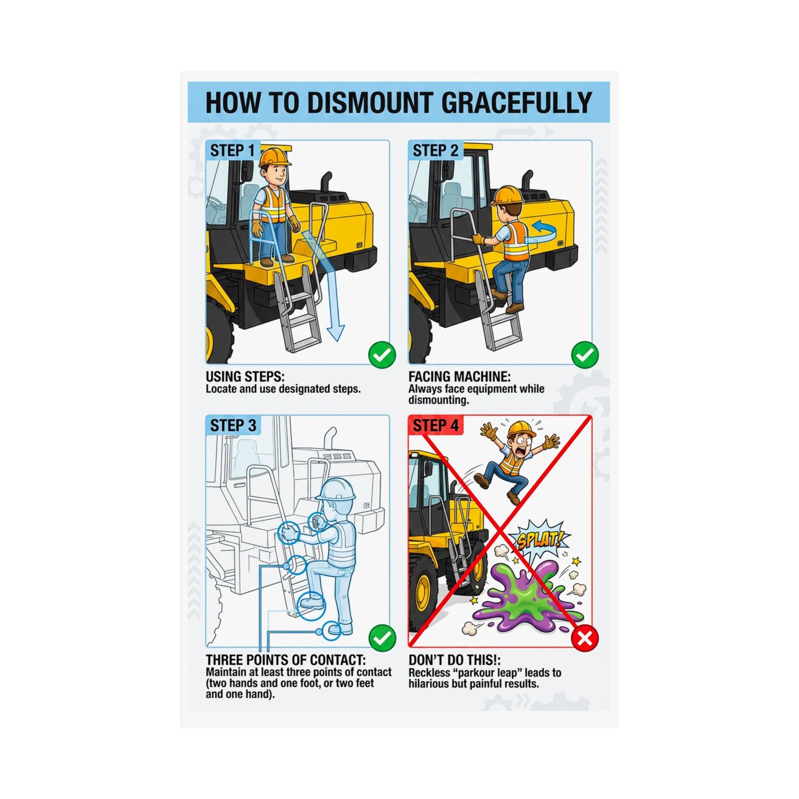 Rather than relying on long explanations, this equipment dismounting safety poster communicates through clean diagrams and simple cues. Operators are reminded to use designated steps, face the machine while exiting, and maintain three points of contact. The final panel clearly highlights what not to do, reinforcing correct behavior through contrast rather than fear.