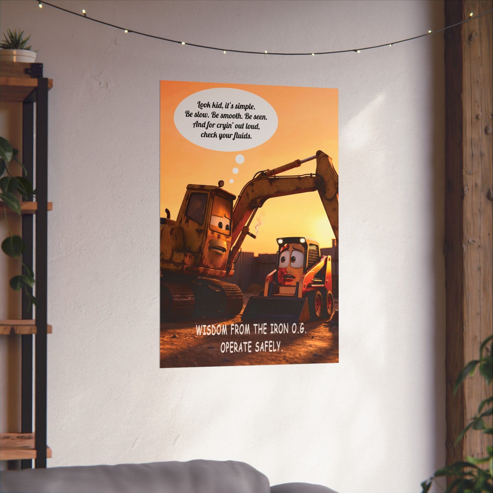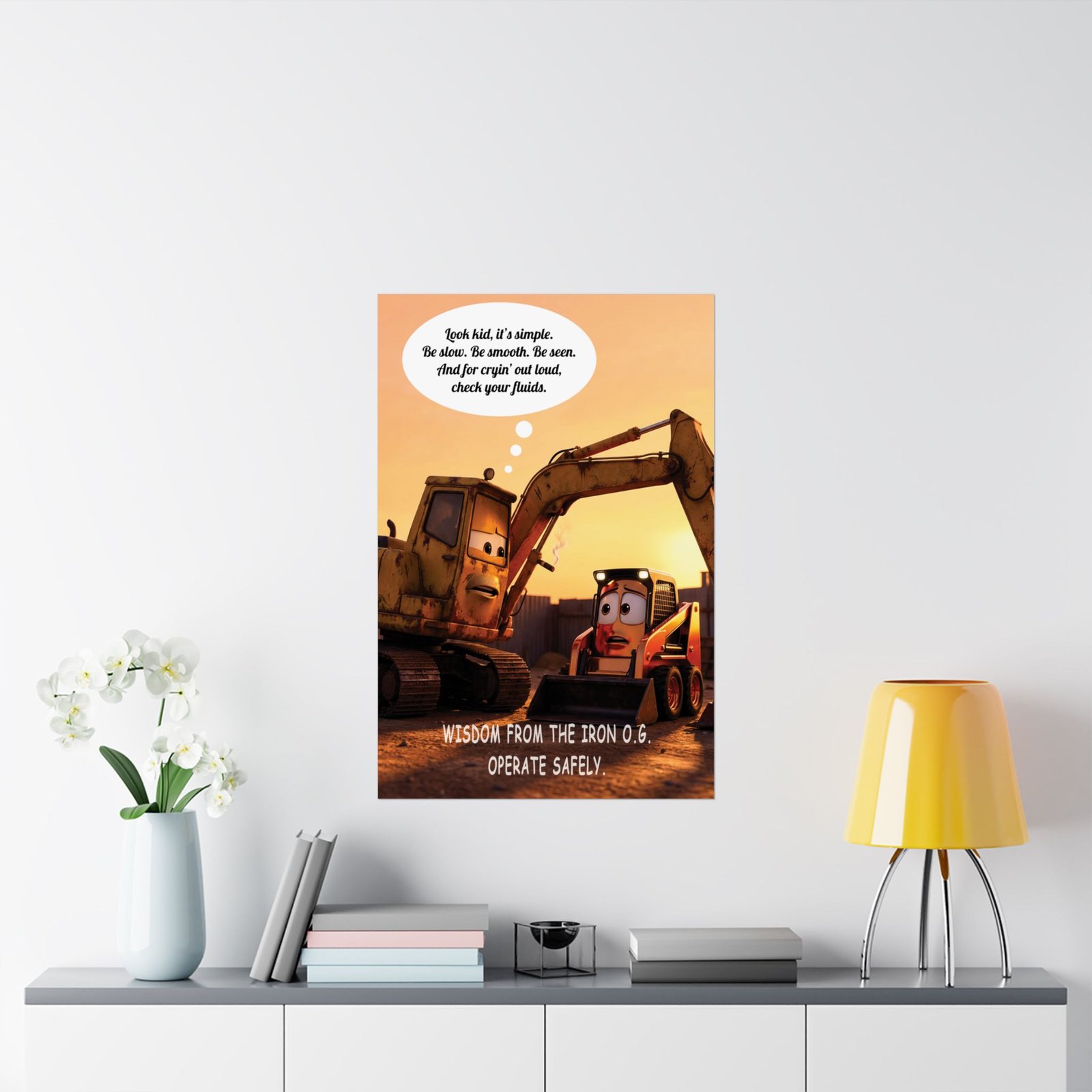 As a heavy equipment safety poster, it fits naturally in workshops, offices, classrooms, training areas, or even home spaces where construction and machinery are part of everyday life. It works as both wall art and a gentle reminder that operating safely is not just about skill—it’s about judgment, patience, and learning from those who came before.