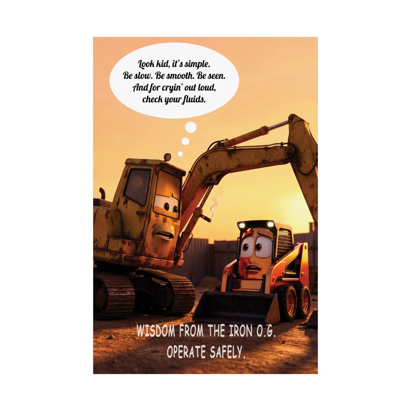 This heavy equipment safety poster presents safety guidance in a way that feels human, calm, and memorable. Set beneath a glowing sunset, the scene shows two machines facing one another—an older, experienced digger offering advice to a younger loader. The moment reads like a quiet exchange on the jobsite, where lessons are shared not through rules, but through experience.