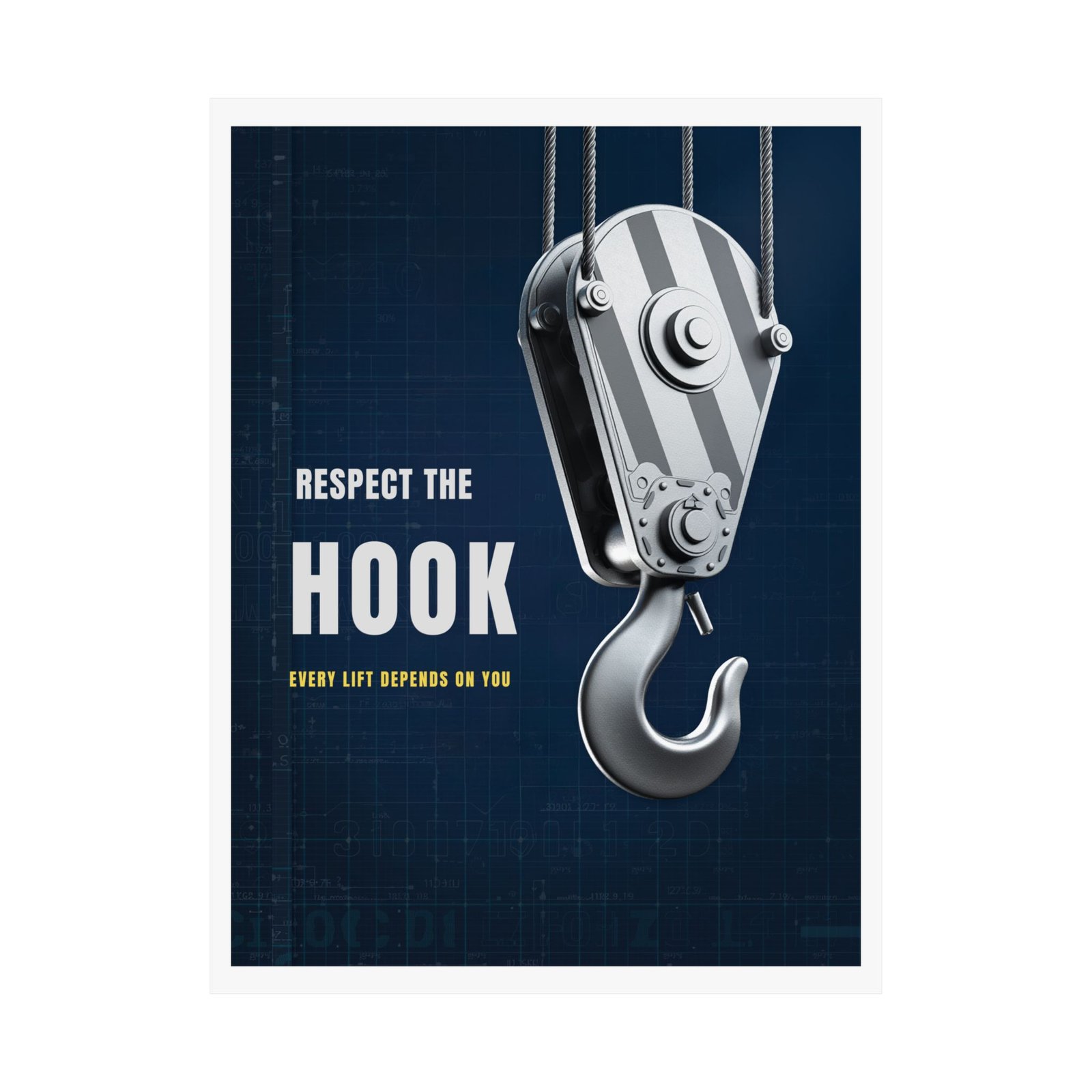 Respect the Hook Every Lift Depends on You Poster is designed to reinforce safe lifting, focus, and technique. A heavy equipment safety poster for gyms and training spaces.