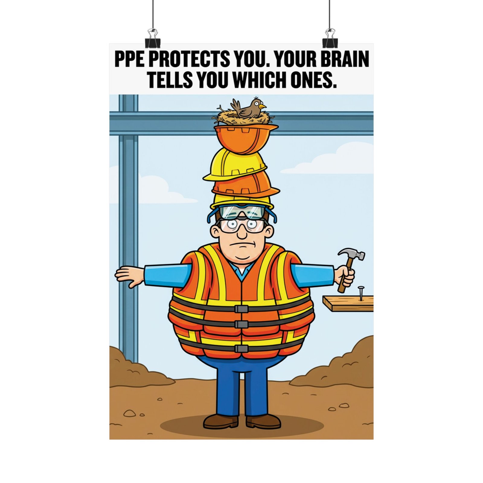 This construction safety poster PPE delivers a clear reminder about personal protective equipment using approachable humor and bold visual storytelling. The illustration features a cartoon construction worker layered with safety gear, paired with the message: “PPE protects you. Your brain tells you which ones.” The design reinforces individual responsibility while keeping the tone friendly and accessible.