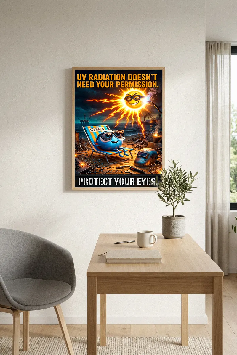 Ideal for high-traffic zones, this funny welding eye protection poster belongs above the PPE staging area, inside the welding curtains, or in the breakroom where it can serve as a conversation starter. Position it at eye level to ensure the “Sunbathers” metaphor hits home every time a worker reaches for their hood. funny welding eye protection poster