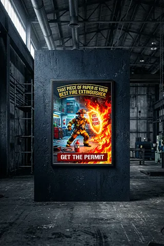 A hot work permit is an administrative control that ensures all hazards have been identified and mitigated before work begins. This poster uses the “shield” metaphor to teach workers that the permit isn’t just paperwork—it is a documented safety plan that protects them from the legal and physical fallout of a facility fire.