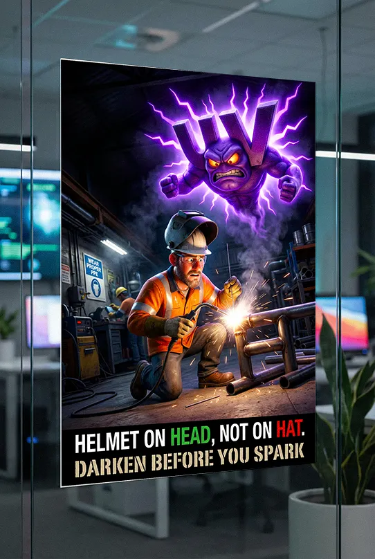The majority of flash burns occur because of “brief exposures”—striking an arc before the helmet is down or while it’s incorrectly positioned. This poster targets those 1-second lapses in judgment, making the consequence of an exposed face feel immediate and personal rather than a theoretical rule.