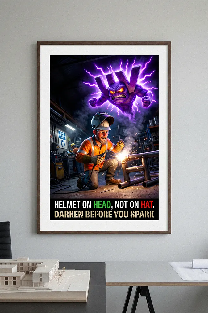 Engineered for the grit of a fabrication shop, this poster is printed on 175gsm museum-grade fine art paper. This welding helmet safety poster features a specialized matte finish that prevents glare from overhead high-output industrial LEDs, ensuring the message remains legible from across the shop floor. The archival inks are designed to withstand the UV exposure inherent in active welding environments.