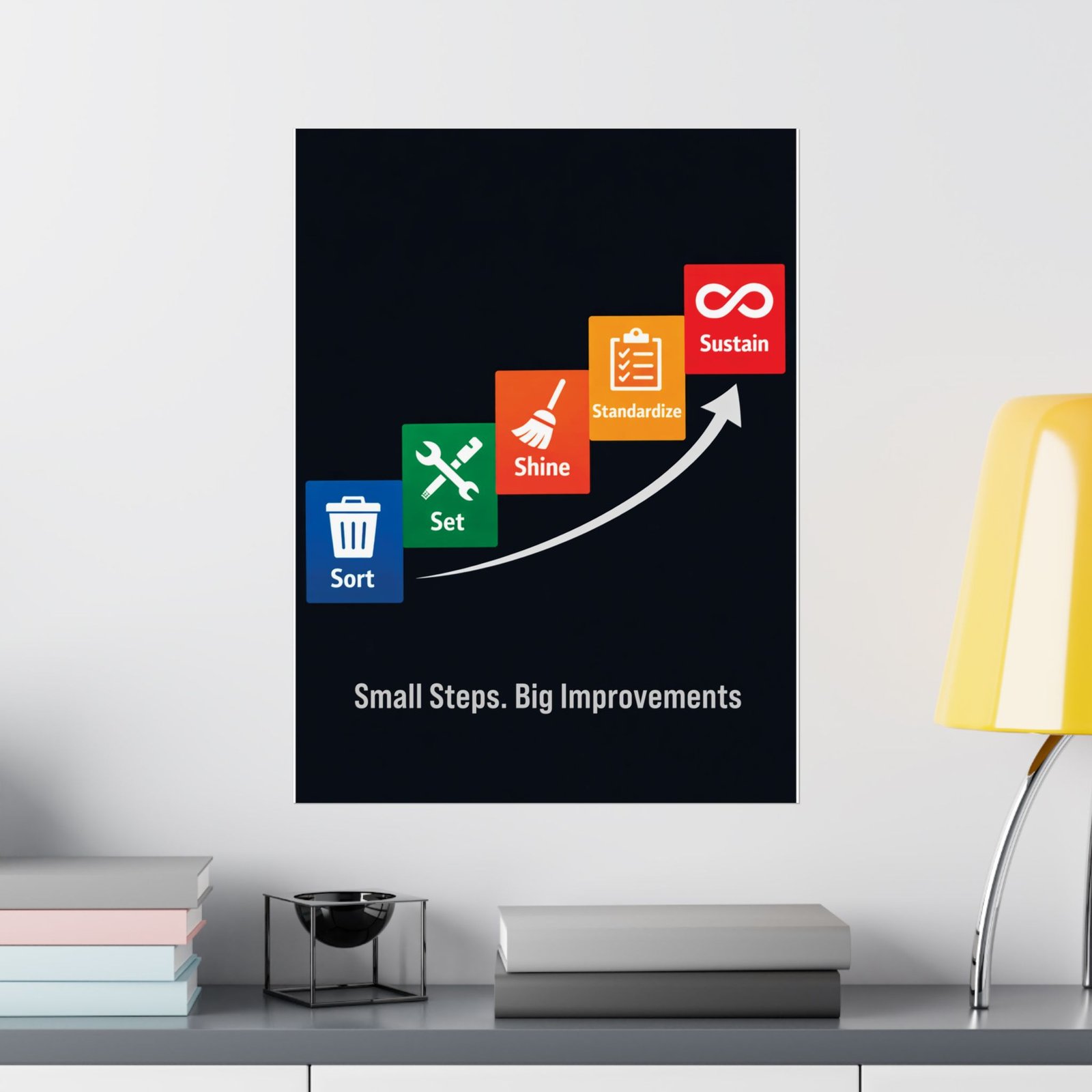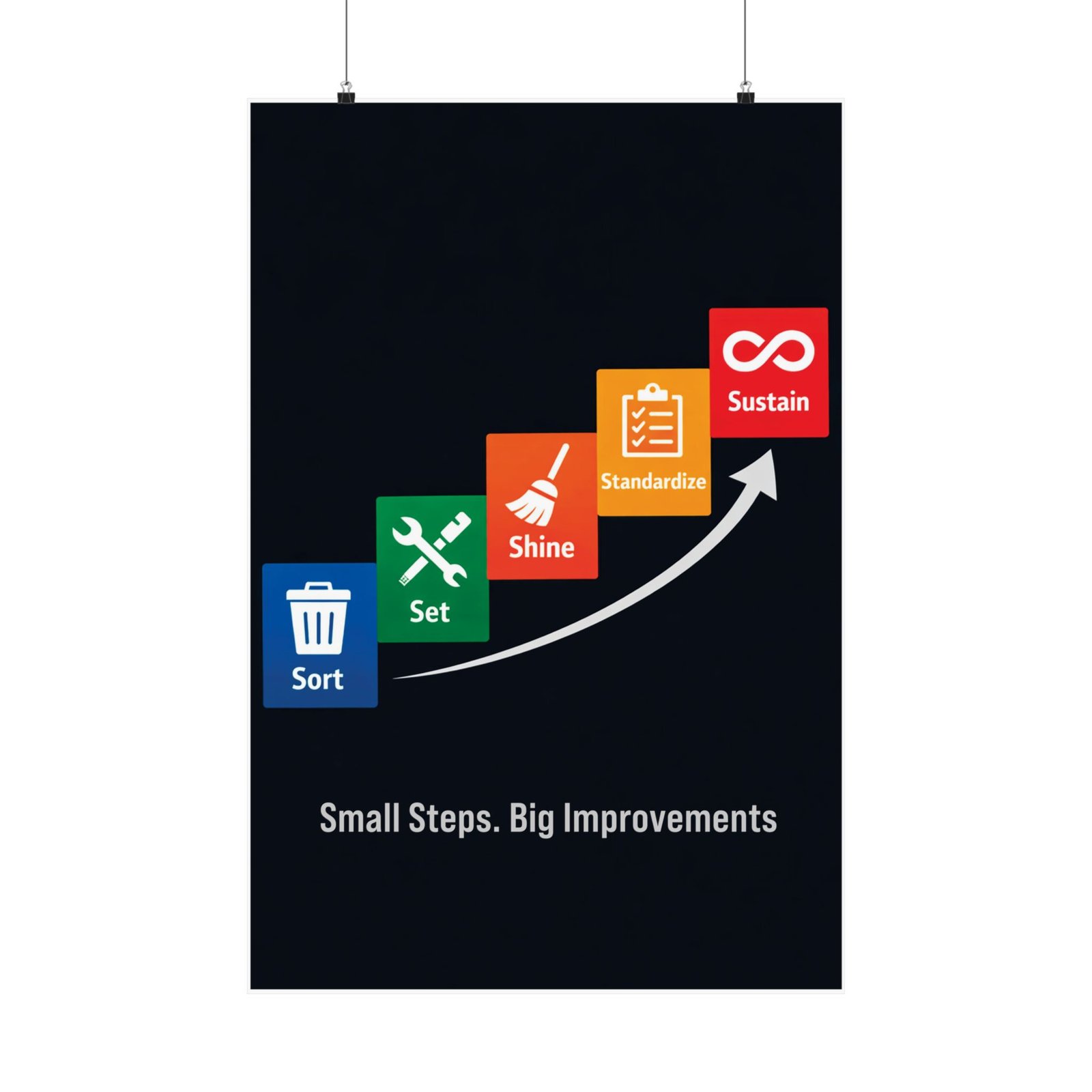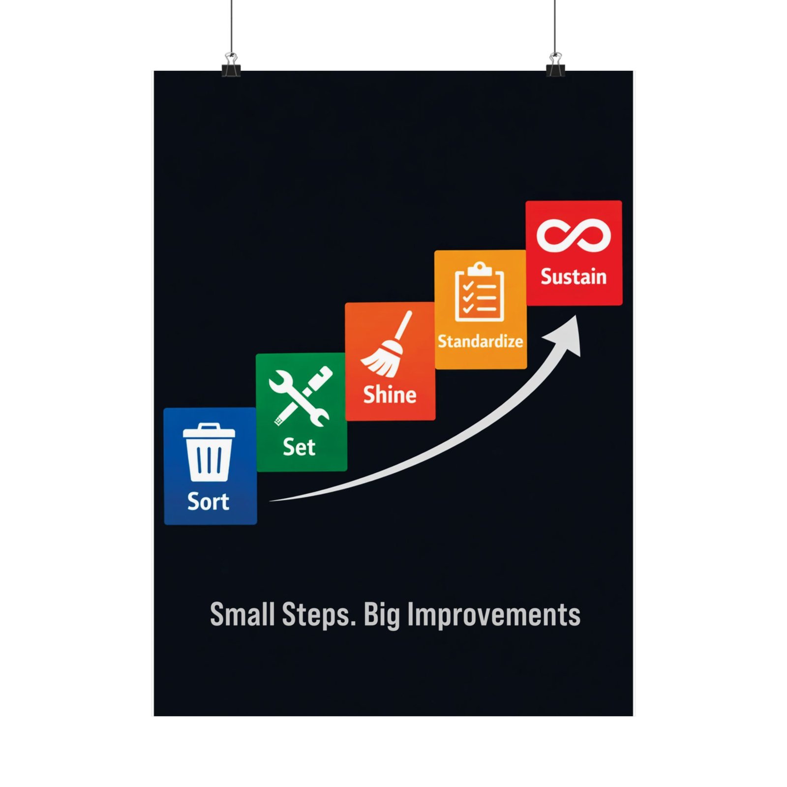 This 5s housekeeping safety poster is printed on 175–189 g/m² heavyweight archival paper, ensuring it remains a professional centerpiece for your Lean transformation program. We utilize Giclée printing for bright, fade-resistant safety colors that make the ascending staircase pop against the deep navy background. The light-absorbing matte finish reduces glare from overhead shop lights, keeping the icons and procedures crisp for close-up viewing during audits. For any safety manager or plant director, this 5s housekeeping safety poster is an audit-ready training aid that supports long-term operational success