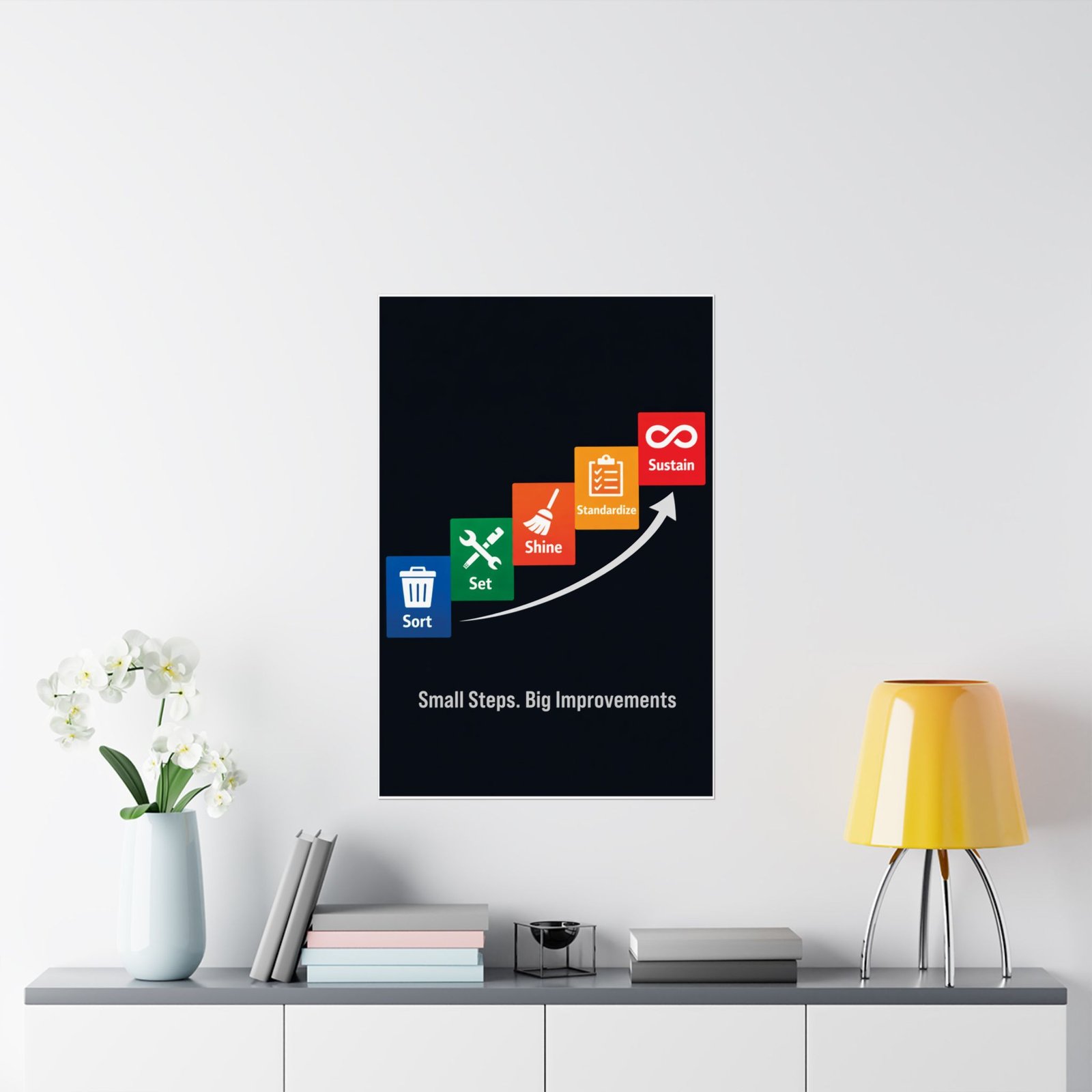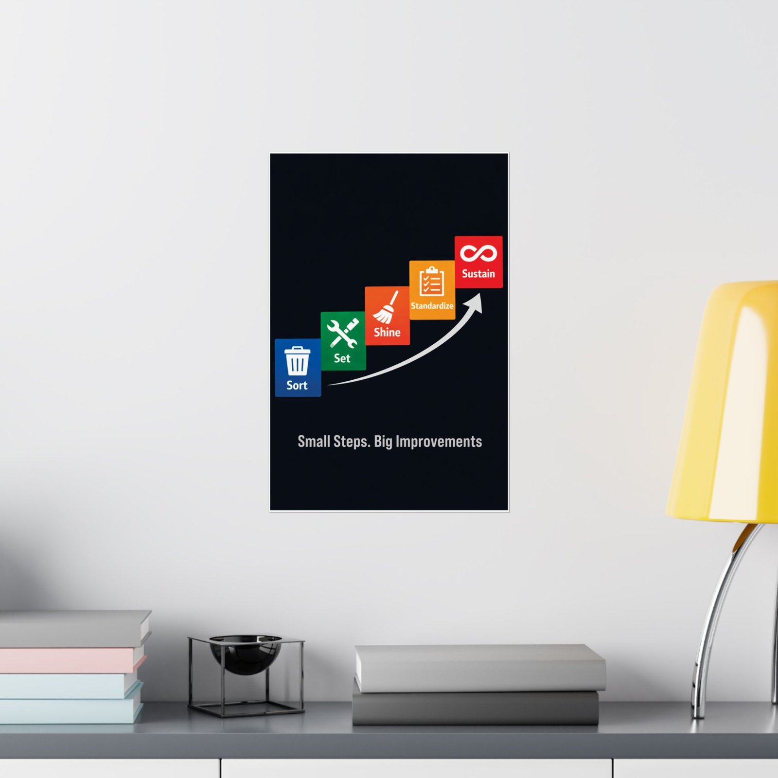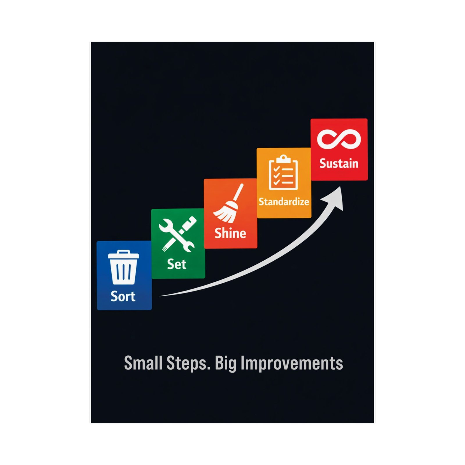 This 5s housekeeping safety poster is printed on 175–189 g/m² heavyweight archival paper, ensuring it remains a professional centerpiece for your Lean transformation program. We utilize Giclée printing for bright, fade-resistant safety colors that make the ascending staircase pop against the deep navy background. The light-absorbing matte finish reduces glare from overhead shop lights, keeping the icons and procedures crisp for close-up viewing during audits. For any safety manager or plant director, this 5s housekeeping safety poster is an audit-ready training aid that supports long-term operational success