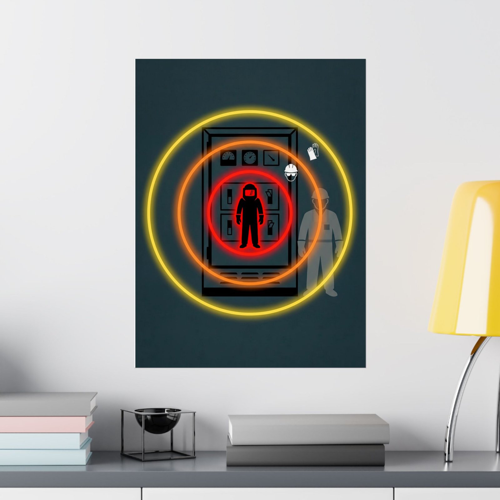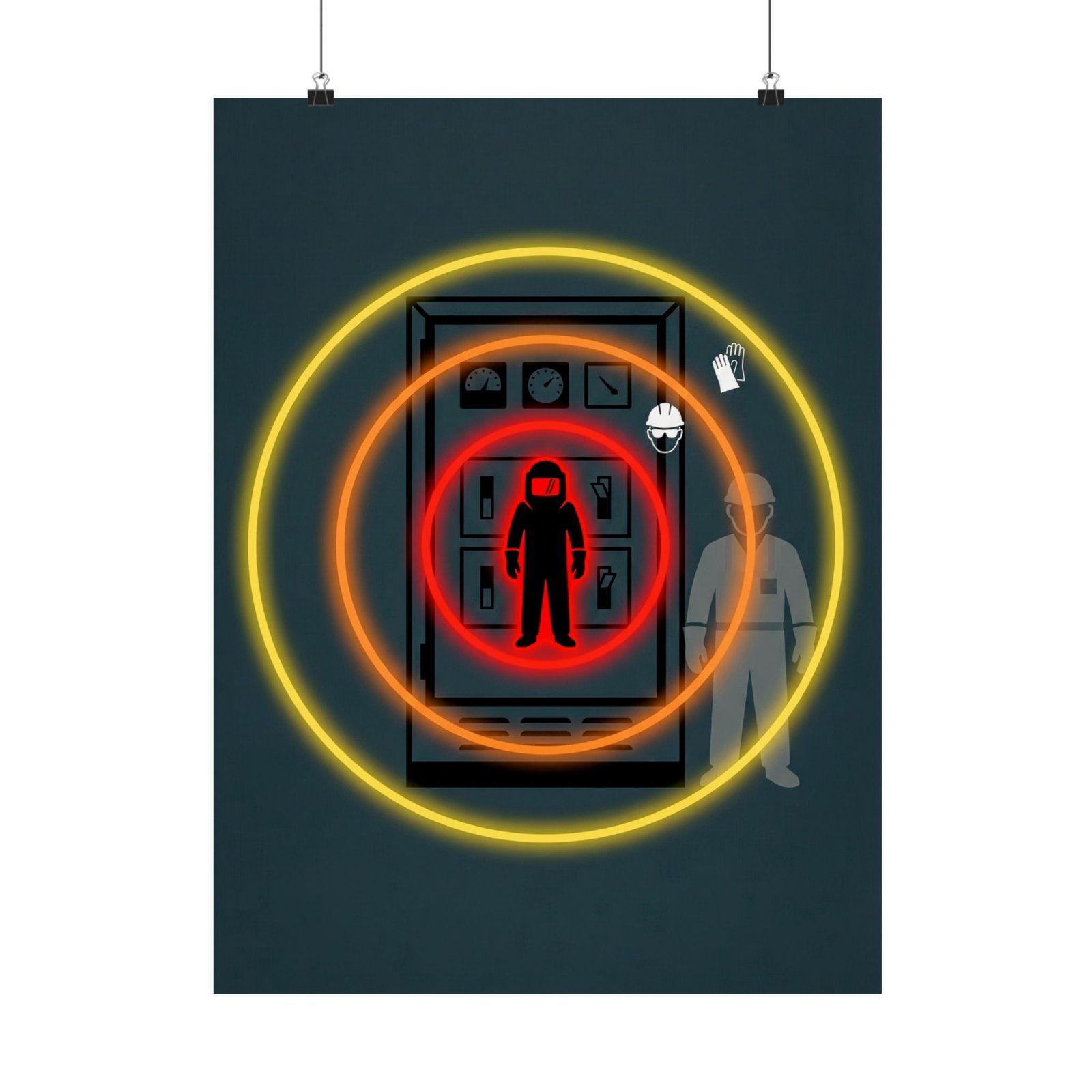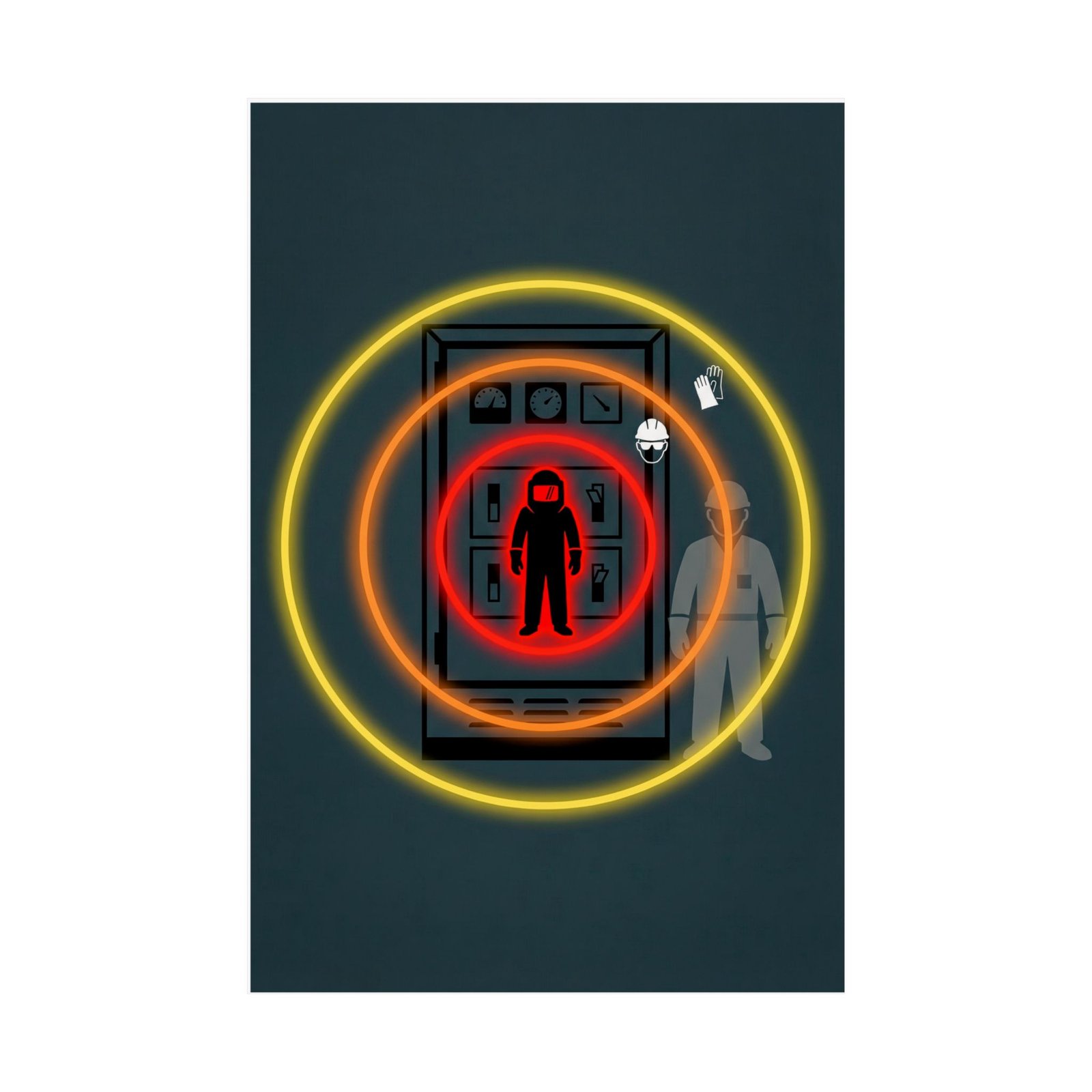 This arc flash safety boundaries poster is printed on 175–189 g/m² heavyweight archival paper, ensuring long-term color stability in professional industrial spaces. We utilize Giclée printing techniques for bright, fade-resistant colors that make the neon-like concentric rings pop against the dark slate-grey background. The light-absorbing matte finish reduces glare from overhead workshop lighting, allowing the technical PPE details to remain visible from a distance. For any safety officer, this arc flash safety boundaries poster is an audit-ready training aid that supports a zero-compromise electrical safety culture.