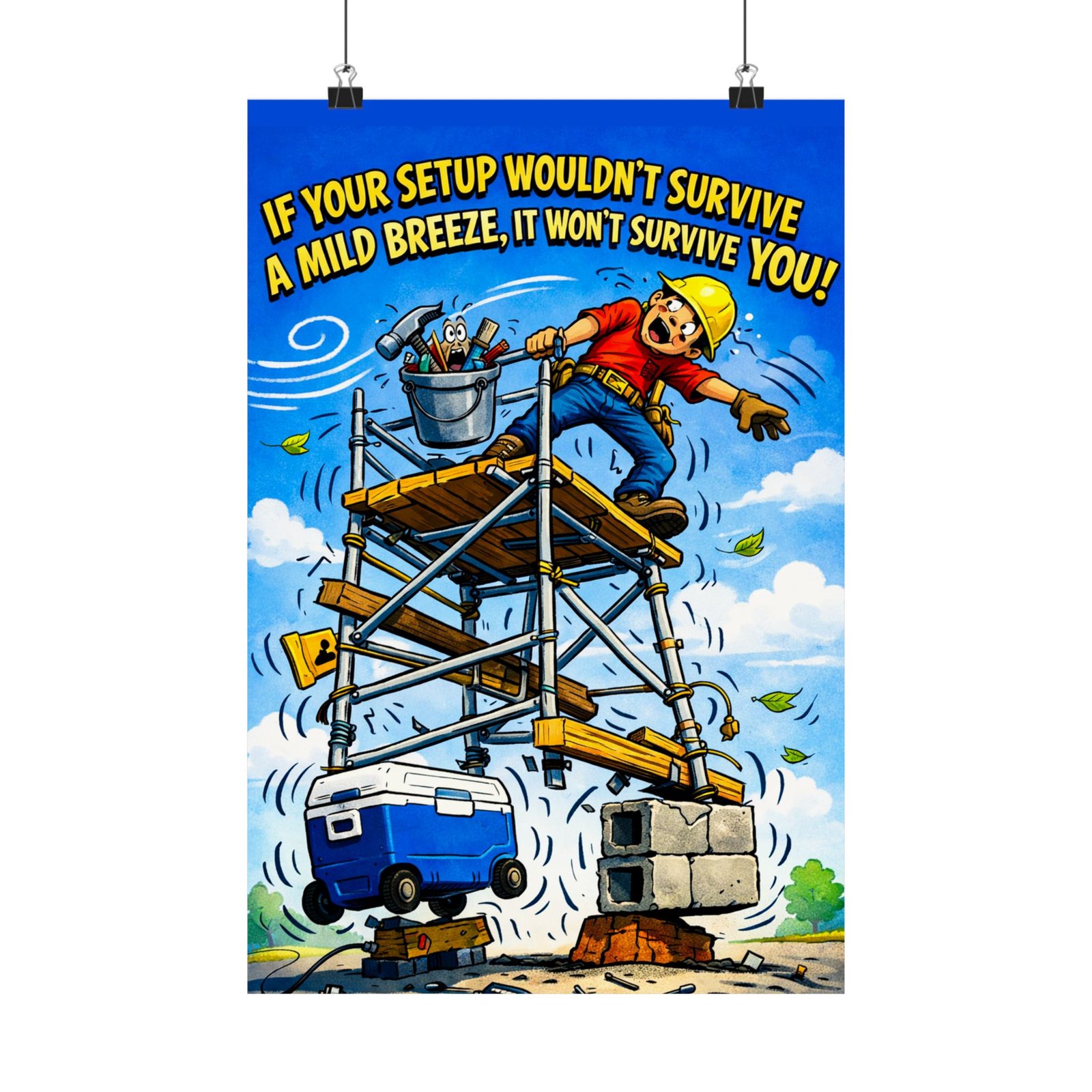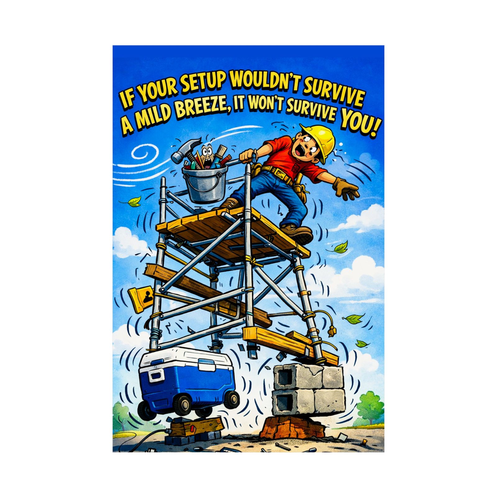 This construction safety poster setup delivers a bold, humorous reminder about the real dangers of poor scaffolding and rushed jobsite preparation. The illustration captures a wildly unstable scaffold stacked with mismatched supports, loose tools, and chaotic movement, paired with the warning: “If your setup wouldn’t survive a mild breeze, it won’t survive you.” The exaggerated style draws attention instantly while reinforcing a serious safety message.