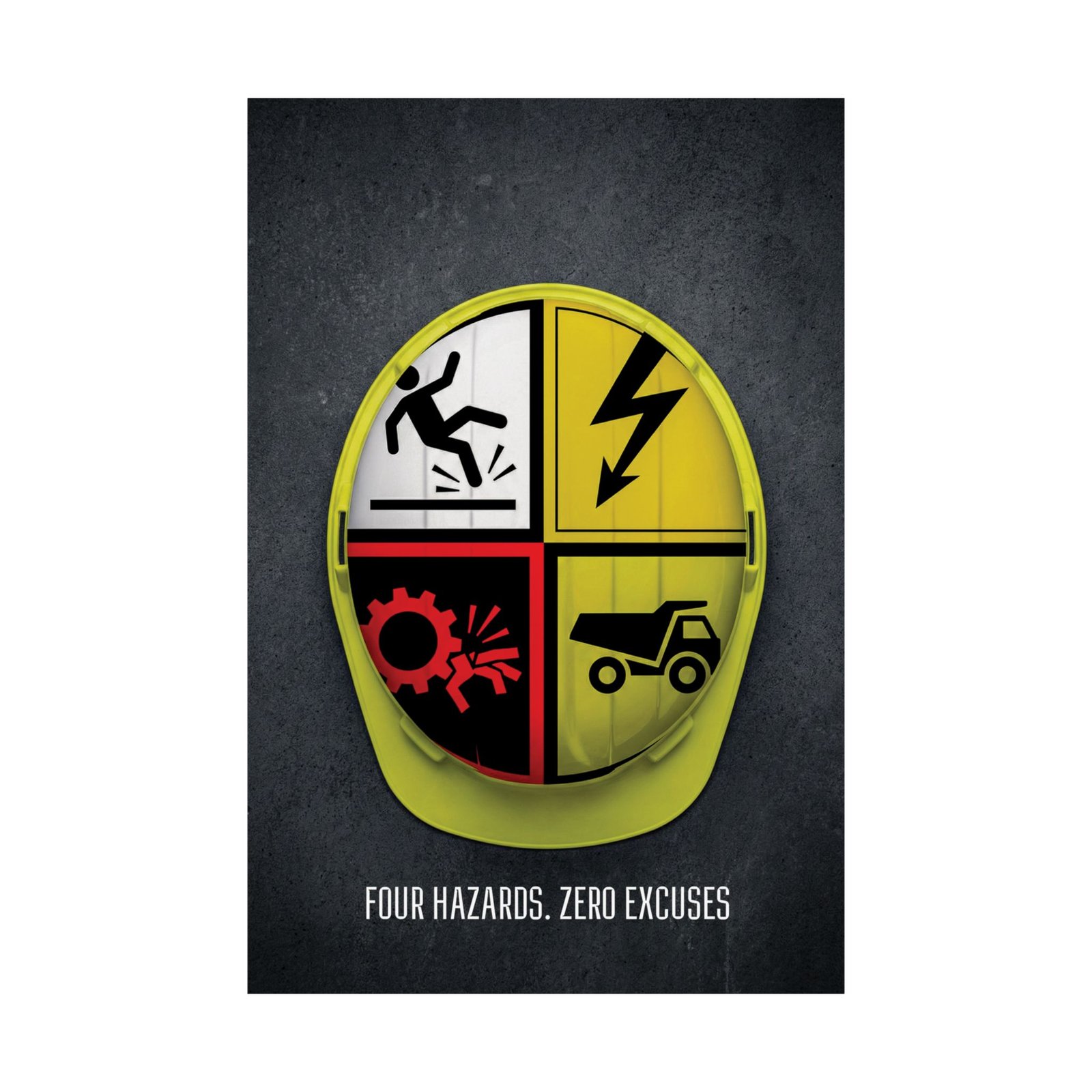 Four Hazards. Zero Excuses. is an uncompromising hazard awareness safety poster designed to reinforce constant attention to common workplace risks. Centered around a bold yellow hard hat, the design presents four instantly recognizable hazard icons—slip, electrical shock, machinery entanglement, and vehicle danger—without unnecessary text or distraction.