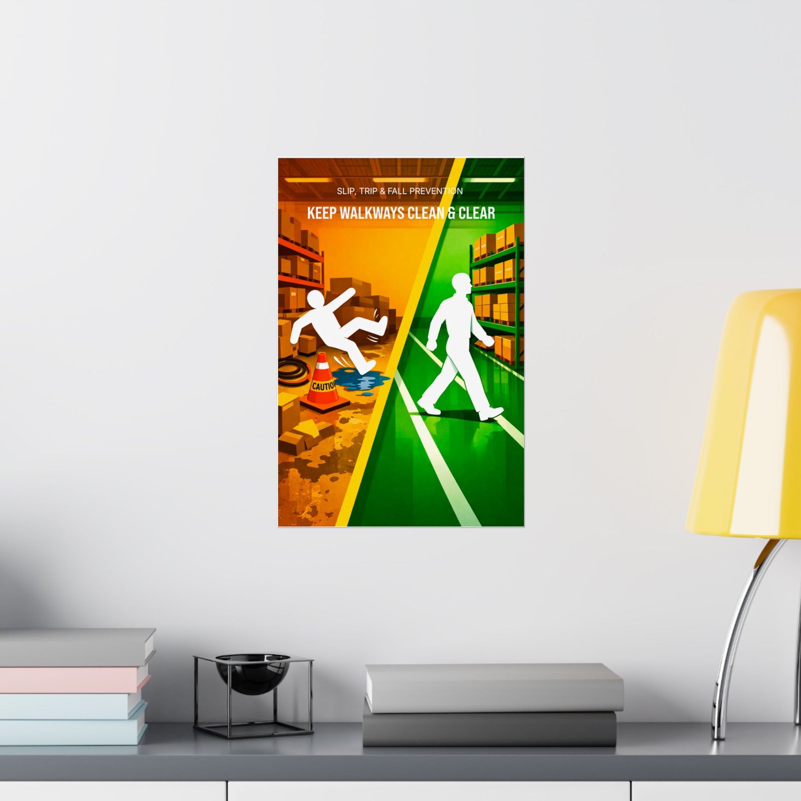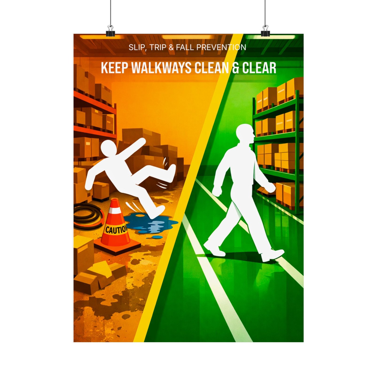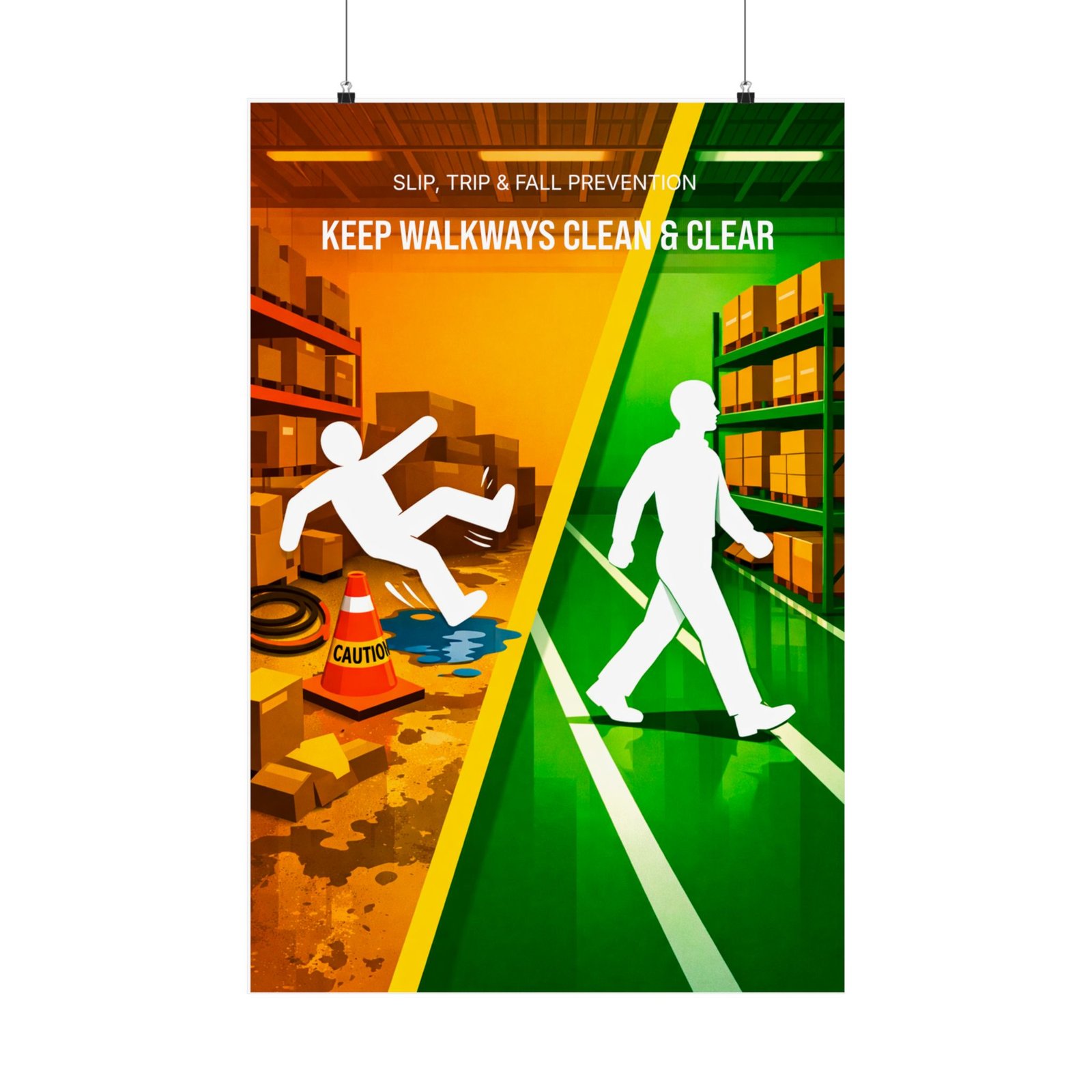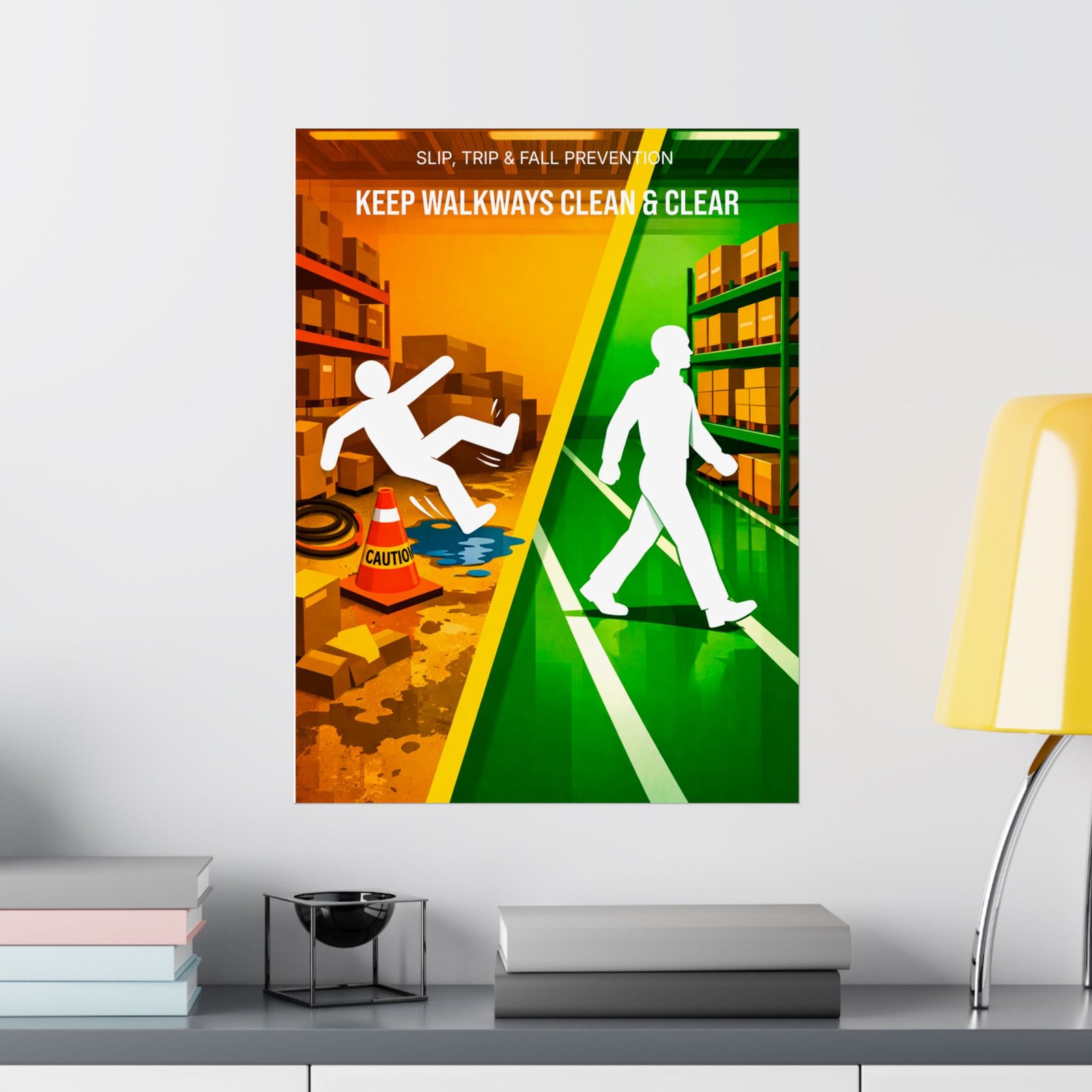 This slip trip and fall prevention poster is printed on 175–189 g/m² heavyweight archival paper, ensuring it remains colorfast and crisp over years of indoor display. We utilize Giclée printing for bright, fade-resistant colors that stay vibrant under the high-intensity lighting typical of distribution centers and retail back rooms. The light-absorbing matte finish reduces glare, ensuring that the “Hazard vs. Safe” details are perfectly readable from a distance of ten feet or more. For any safety manager, this slip trip and fall prevention poster is an evergreen, high-volume asset for reinforcing site safety audits and general duty clause prevention.