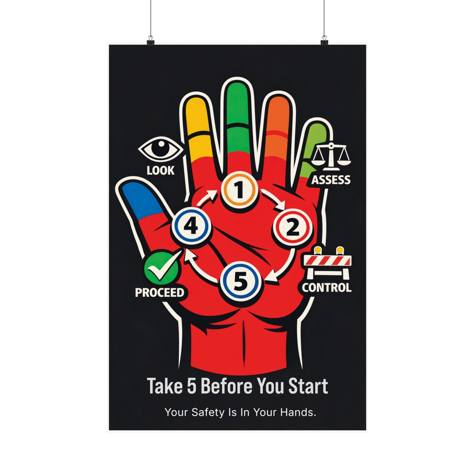 This take 5 safety poster is printed on 175–189 g/m² heavyweight archival paper, ensuring it remains a vibrant and professional centerpiece for years of indoor display. We utilize Giclée printing for bright, fade-resistant safety-red and green tones that command attention in busy break rooms or site trailers. The light-absorbing matte finish reduces glare from overhead lighting, keeping the five-step workflow crisp and easy to follow at a distance. For any safety coordinator or site supervisor, this take 5 safety poster is an audit-ready training aid that supports a proactive, mature safety culture.