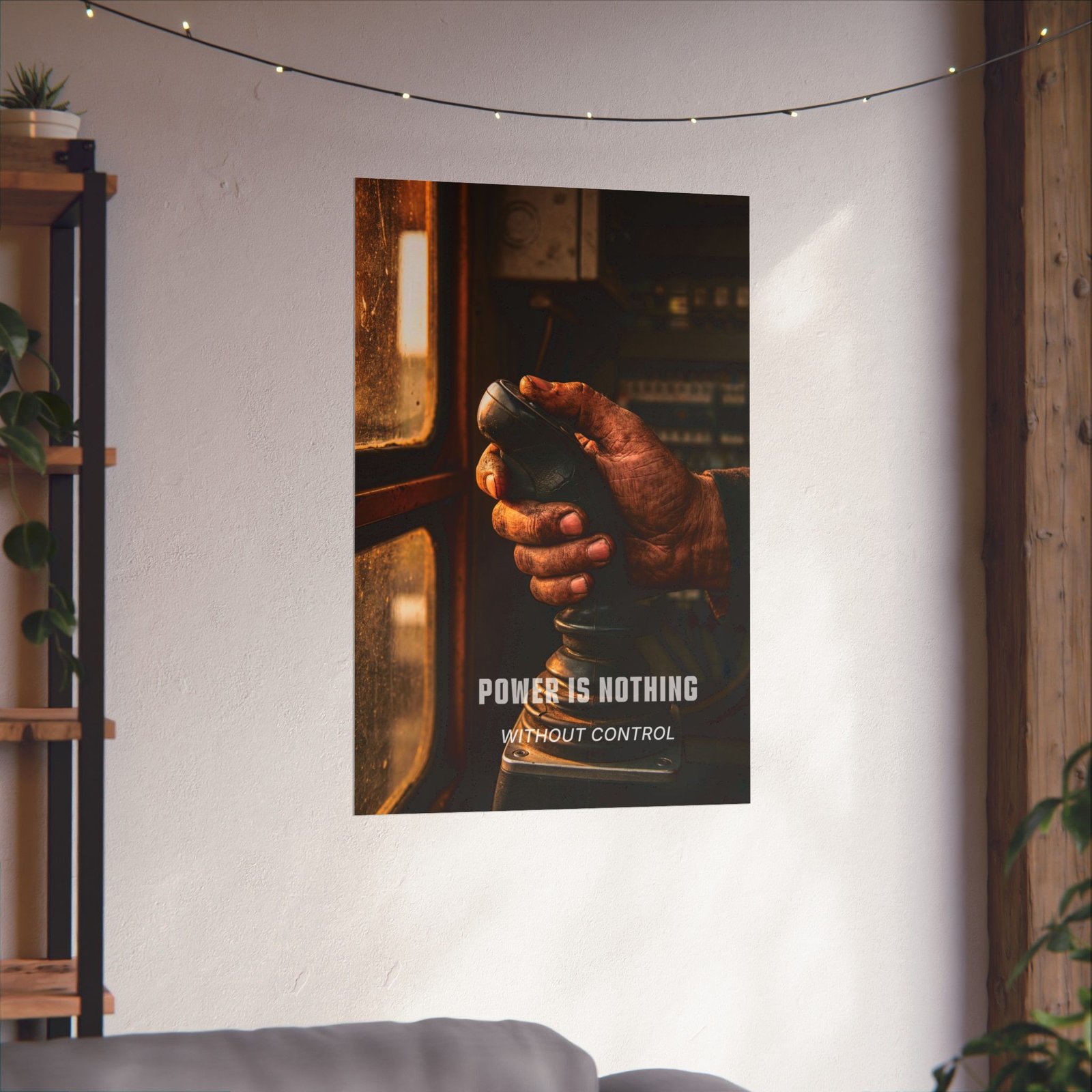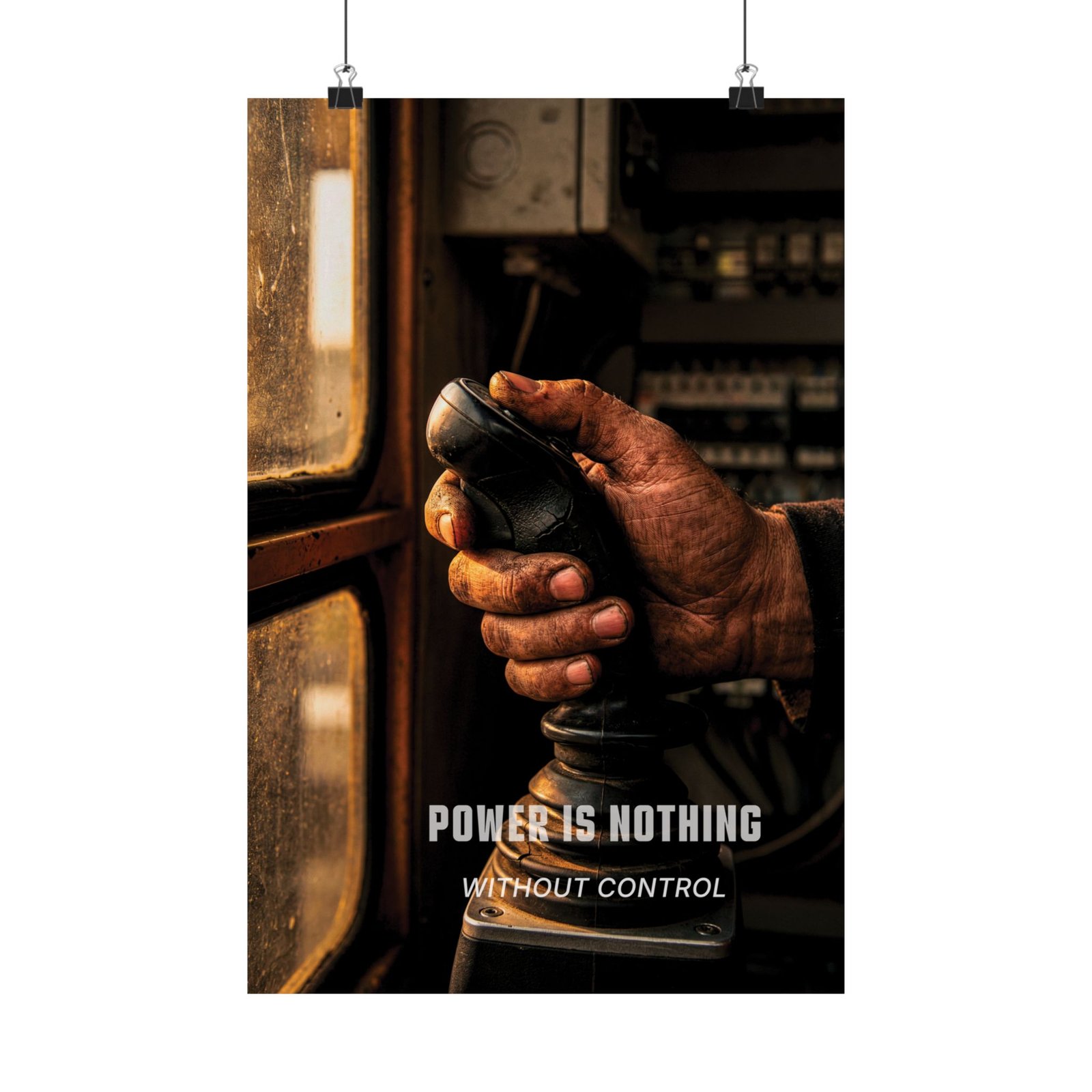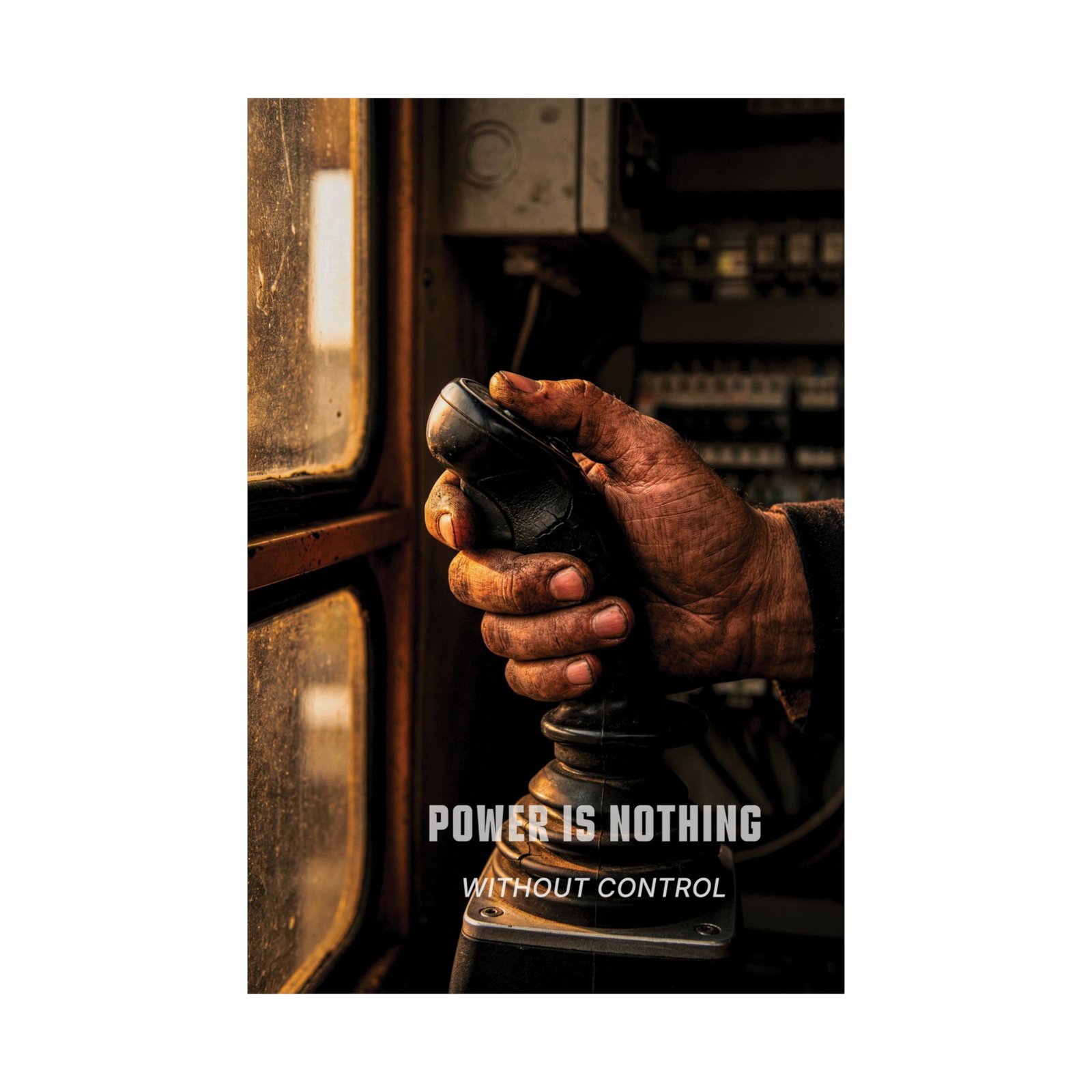 Power Is Nothing Without Control is a mastery-focused workplace safety control poster that speaks to professionals who value precision over force. The close-up image of a weathered hand gripping a control stick captures a moment of concentration — where experience, restraint, and judgment define safe outcomes.